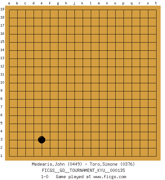 Last move : 1-0 2012 April 17 22:17:27 [Event "FICGS__GO__TOURNAMENT_KYU__000135"] [Site "FICGS"] [Date "2012.04.17"] [Round "1"] [Black "Medearis,John"] [White "Toro,Simone"] [Result "1-0"] [Rating 1 "0449"] [Rating 2 "0376"] 1.e3 1-0 Here are the names of the openings (joseki) played in the four corners : Corner d4 : e3 1-0 Mokuhazushi (Waemok, Wai`mu`) 5-3 Point. The mokuhazushi (5-3) point was popular in the Edo period in Japan (1600 - 1867). It emphasizes influence; territorially, it is inferior to the 3-4 point. Player Black won this Go (weiqi, baduk) game. Follow this game move after move (download)Territory is a closed space where time no longer exists. The transformation around it slower alter it, and sometimes it cracks open like a rotten egg at the least shock. (Pierre Audouard) We need strong personalities and only one world champion to attract sponsors. (Anatoly Karpov)