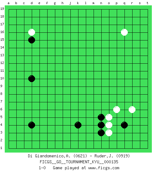 Last move : 1-0 2012 June 3 15:5:33 [Event "FICGS__GO__TOURNAMENT_KYU__000135 "] [Site "FICGS"] [Date "2012.04.17"] [Round "1"] [Black "Di Giandomenico,Alfonso "] [White "Ruder,John "] [Result "1-0"] [Rating 1 "0621"] [Rating 2 "0919"] 1.d4 q16 2.q4 d16 3.k4 r6 4.d10 o3 5.n3 o4 6.n4 o5 7.n5 p6 8.d15 1-0 This go game has been lost on time (started : 2012.04.17 6:36:56) Here are the names of the openings (joseki) played in the four corners : Corner q4 : q4 r6Hoshi (Hwajeom, Seongjeom, Xingwei`) 4-4 Point. The star or hoshi (4-4) point, emphasizing influence at the potential expense of territory.Ikken Kakari (Hankan Keolch'im, Yi Gua`jiao~, 1-Space Low Approach). White 2 is the standard approach move to the 4-4. Corner d16 : d16 d15Hoshi (Hwajeom, Seongjeom, Xingwei`) 4-4 Point. The star or hoshi (4-4) point, emphasizing influence at the potential expense of territory. Corner d4 : d4 1-0Hoshi (Hwajeom, Seongjeom, Xingwei`) 4-4 Point. The star or hoshi (4-4) point, emphasizing influence at the potential expense of territory. Player Black won this Go (weiqi, baduk) game.Follow this game move after move (download ) Only amateurs try to come up with fancy moves. (Anonymous) The weakness of an artist is dogma. (Josh Waitzkin)