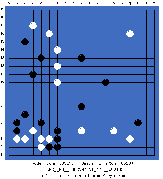 Last move : 0-1 2012 June 5 3:9:35 [Event "FICGS__GO__TOURNAMENT_KYU__000135 "] [Site "FICGS"] [Date "2012.04.17"] [Round "1"] [Black "Ruder,John "] [White "Bezushko,Anton "] [Result "0-1"] [Rating 1 "0919"] [Rating 2 "0520"] 1.n10 q3 2.r5 o4 3.k7 d17 4.c15 f16 5.k13 g10 6.d11 d4 7.c6 k4 8.g4 e3 9.e5 g12 10.e13 g14 11.b4 c3 12.f2 f3 13.g3 e2 14.g2 b3 15.b5 q16 0-1 This go game has been lost on time (started : 2012.04.17 6:36:56) Here are the names of the openings (joseki) played in the four corners : Corner q4 : q3 r5Komoku (Somok, Xiao~mu`) 3-4 Point. The komoku (3-4) point is the traditional corner enclosure move..Ikken Kakari (Hankan Keolch'im, Yi Gua`jiao~, 1-Space Low Pincer). The small knight move is the basic approach move to the 3-4 point stone. It has been continually used for over four centuries. There are limitless variations, with new moves constantly being discovered. Black 2 opens the door to a treaure store of joseki. Corner d16 : d17 c15Komoku (Somok, Xiao~mu`) 3-4 Point. The komoku (3-4) point is the traditional corner enclosure move..Ikken Kakari (Hankan Keolch'im, Yi Gua`jiao~, 1-Space Low Pincer). The small knight move is the basic approach move to the 3-4 point stone. It has been continually used for over four centuries. There are limitless variations, with new moves constantly being discovered. Black 2 opens the door to a treaure store of joseki. Corner d4 : d4 c6Hoshi (Hwajeom, Seongjeom, Xingwei`) 4-4 Point. The star or hoshi (4-4) point, emphasizing influence at the potential expense of territory.Ikken Kakari (Hankan Keolch'im, Yi Gua`jiao~, 1-Space Low Approach). Black 2 is the standard approach move to the 4-4. Player White won this Go (weiqi, baduk) game.Follow this game move after move (download ) Don't make territory near thickness. (Anonymous) Mandala - that's it! 16x16 squares as multiple of the four and the eight because of the Four Noble Truths and the Noble Eightfold Path. (Heinz-Georg Lehnhoff about Big Chess)
