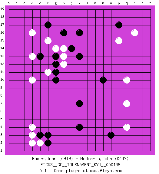 Last move : 0-1 2012 June 10 3:58:5 [Event "FICGS__GO__TOURNAMENT_KYU__000135 "] [Site "FICGS"] [Date "2012.04.17"] [Round "1"] [Black "Ruder,John "] [White "Medearis,John "] [Result "0-1"] [Rating 1 "0919"] [Rating 2 "0449"] 1.n10 r16 2.k13 d4 3.k7 d16 4.g10 q4 5.p17 p15 6.k16 d10 7.o3 q7 8.k4 q10 9.f3 e2 10.e3 d3 11.f2 d2 12.f17 f15 13.h16 h14 14.j14 h12 15.g13 h13 16.g12 f11 17.g11 g14 18.e13 d13 0-1 This go game has been lost on time (started : 2012.04.17 6:36:56) Here are the names of the openings (joseki) played in the four corners : Corner q16 : r16 p17Komoku (Somok, Xiao~mu`) 3-4 Point. The komoku (3-4) point is the traditional corner enclosure move..Ikken Kakari (Hankan Keolch'im, Yi Gua`jiao~, 1-Space Low Pincer). The small knight move is the basic approach move to the 3-4 point stone. It has been continually used for over four centuries. There are limitless variations, with new moves constantly being discovered. Black 2 opens the door to a treaure store of joseki. Corner q4 : q4 o3Hoshi (Hwajeom, Seongjeom, Xingwei`) 4-4 Point. The star or hoshi (4-4) point, emphasizing influence at the potential expense of territory.Ikken Kakari (Hankan Keolch'im, Yi Gua`jiao~, 1-Space Low Approach). Black 2 is the standard approach move to the 4-4. Corner d4 : d4 f3Hoshi (Hwajeom, Seongjeom, Xingwei`) 4-4 Point. The star or hoshi (4-4) point, emphasizing influence at the potential expense of territory.Ikken Kakari (Hankan Keolch'im, Yi Gua`jiao~, 1-Space Low Approach). Black 2 is the standard approach move to the 4-4. Corner d16 : d16 f17Hoshi (Hwajeom, Seongjeom, Xingwei`) 4-4 Point. The star or hoshi (4-4) point, emphasizing influence at the potential expense of territory.Ikken Kakari (Hankan Keolch'im, Yi Gua`jiao~, 1-Space Low Approach). Black 2 is the standard approach move to the 4-4. Player White won this Go (weiqi, baduk) game.Follow this game move after move (download ) On the third line, four die, six live. (Anonymous) Cactus - It is depressed cucumber. (Ilmars Cirulis)