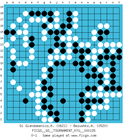 Last move : 0-1 2012 November 25 20:45:54 [Event "FICGS__GO__TOURNAMENT_KYU__000135"] [Site "FICGS"] [Date "2012.04.17"] [Round "1"] [Black "Di Giandomenico,Alfonso"] [White "Bezushko,Anton"] [Result "0-1"] [Rating 1 "0621"] [Rating 2 "0520"] 1.d4 q16 2.k4 d16 3.q4 c6 4.q10 f3 5.g3 f4 6.g4 e5 7.q15 p15 8.q14 r16 9.r15 q12 10.r12 r13 11.q11 q13 12.r11 p14 13.q7 o11 14.n4 d10 15.k16 h16 16.j15 m16 17.n11 g14 18.j14 m14 19.m13 l13 20.m12 l12 21.m10 j12 22.k10 h10 23.j10 h11 24.h9 g9 25.h8 g8 26.g7 f7 27.g6 p11 28.o10 p10 29.p9 g2 30.h2 f2 31.h3 h1 32.j1 g1 33.j2 o9 34.n10 q9 35.q8 r9 36.p8 s12 37.s11 s13 38.s9 r8 39.s10 r7 40.r6 q6 41.s6 q5 42.o8 r5 43.s7 r4 44.n9 q3 45.p4 p3 46.o3 s5 47.t6 t5 48.s8 p5 49.o4 r3 50.o6 o5 51.n5 o2 52.n2 p2 53.n1 g5 54.h5 f5 55.h6 f6 56.p6 n13 57.n12 o13 58.o12 p12 59.l14 l15 60.l16 m17 61.l18 m18 62.l17 j18 63.k15 k14 64.h17 j17 65.h18 j16 66.g16 g17 67.g18 f17 68.f18 e17 69.e18 d18 70.d17 c17 71.h15 g15 72.k13 l14 73.k12 k11 74.j13 l11 75.h12 j11 76.c11 c10 77.d11 e11 78.e13 e12 79.d12 d13 80.c13 d14 81.c14 b11 82.c12 c15 83.b15 b16 84.a15 b12 85.e14 d15 86.b13 a13 87.b10 b14 88.b9 b7 89.t12 t13 90.t11 o1 0-1 Here are the names of the openings (joseki) played in the four corners : Corner d4 : d4 c6 Hoshi (Hwajeom, Seongjeom, Xingwei`) 4-4 Point. The star or hoshi (4-4) point, emphasizing influence at the potential expense of territory. Ikken Kakari (Hankan Keolch'im, Yi Gua`jiao~, 1-Space Low Approach). White 2 is the standard approach move to the 4-4. Corner q16 : q16 q15 Hoshi (Hwajeom, Seongjeom, Xingwei`) 4-4 Point. The star or hoshi (4-4) point, emphasizing influence at the potential expense of territory. Player White won this Go (weiqi, baduk) game. Follow this game move after move (download)More haste less speed. (John Fairbairn) Patience, use the Force, think ! (Obi-Wan Kenobi in Star Wars ep.2)