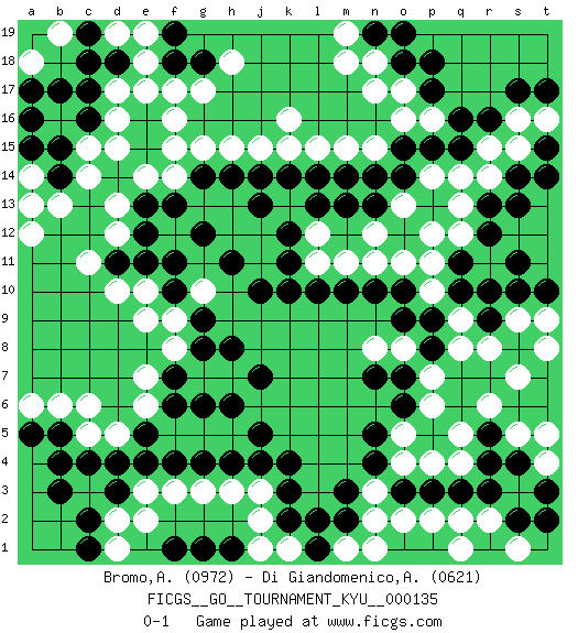 Last move : 0-1 2012 October 28 22:7:48 [Event "FICGS__GO__TOURNAMENT_KYU__000135"] [Site "FICGS"] [Date "2012.04.17"] [Round "1"] [Black "Bromo,Alexis"] [White "Di Giandomenico,Alfonso"] [Result "0-1"] [Rating 1 "0972"] [Rating 2 "0621"] 1.q16 d16 2.d4 d10 3.k4 k16 4.k10 d5 5.e5 c5 6.c4 q4 7.q10 q9 8.p9 q8 9.p8 p7 10.o7 p6 11.o6 o5 12.n5 o4 13.n4 n3 14.m3 n2 15.m2 m1 16.l1 n1 17.l2 e6 18.f6 e7 19.f7 f8 20.g8 f9 21.g9 p16 22.p15 o16 23.p17 o17 24.o15 n15 25.n14 m15 26.m14 l15 27.l14 j15 28.j14 h15 29.h14 g15 30.g14 f14 31.f13 e14 32.e13 d13 33.e12 d12 34.e11 e10 35.f10 e9 36.d11 c11 37.o18 n18 38.p18 n17 39.r9 r8 40.s8 s9 41.r10 s7 42.s10 t8 43.n19 m19 44.o19 m18 45.b5 b6 46.b4 a6 47.a5 g10 48.f11 f5 49.e4 g7 50.g6 h7 51.h8 g5 52.h6 h5 53.j7 f3 54.f4 e3 55.d3 d2 56.c2 d1 57.c1 e2 58.g4 g3 59.h4 h3 60.j4 j3 61.k3 j2 62.g1 k1 63.k2 j1 64.b3 c6 65.o3 o2 66.p3 p2 67.q3 q2 68.r3 r2 69.r4 q5 70.r5 r6 71.s2 s5 72.s4 t4 73.t3 t5 74.t2 s1 75.t10 t9 76.c17 d17 77.c16 c15 78.b15 c14 79.b14 b13 80.d18 e18 81.a13 a12 82.e17 d19 83.c18 f17 84.e16 d15 85.e15 f15 86.c19 e19 87.f18 f16 88.f19 e17 89.g18 b16 90.b17 a14 91.a16 a13 92.a15 a18 93.a17 b19 94.j5 g13 95.g12 h13 96.j13 h12 97.h11 j12 98.k12 j11 99.j10 k13 100.k14 l12 101.l13 l11 102.k11 p10 103.o10 p11 104.q11 o11 105.n10 n11 106.l10 m11 107.m10 q12 108.r12 q13 109.r13 q14 110.q15 r14 111.s14 r15 112.r16 s15 113.s13 s16 114.s17 t16 115.t17 o13 116.o14 p14 117.s11 p12 118.n13 n12 119.t14 o8 120.o9 n8 121.n7 h18 122.r1 q1 123.m13 k15 124.f1 p4 125.h1 g17 126.t15 pass 127.pass pass 128.pass pass 129.pass pass 130.pass 0-1 Thibault de Vassal Hello, my count is W+14.5 as both g1 & g3 live... feel free to comment if you don't agree. Best regards, Thibault Alexis Bromo Hi! If black moves will be h2-g2-f2, white - e1. black - g1 an so on? white will not make stable construction... Thibault de Vassal It is not really obvious, so it had to be proved... After Bg1, Wg2, then? Feel free to show the complete main lines. Simon Zeckarias Yeah, this is seki - both live. See sensei's library for all vars: http://senseis.xmp.net/?RectangularSix Thibault de Vassal Thank you very much for sharing this Simon :) Here are the names of the openings (joseki) played in the four corners : Corner d4 : d4 d5 Hoshi (Hwajeom, Seongjeom, Xingwei`) 4-4 Point. The star or hoshi (4-4) point, emphasizing influence at the potential expense of territory. Corner q16 : q16 p16 Hoshi (Hwajeom, Seongjeom, Xingwei`) 4-4 Point. The star or hoshi (4-4) point, emphasizing influence at the potential expense of territory. Player White won this Go (weiqi, baduk) game. Follow this game move after move (download)The poor player plays the opponent's game for him. (Anonymous) What doesn't kill us makes us stronger. (Friedrich Nietzsche)