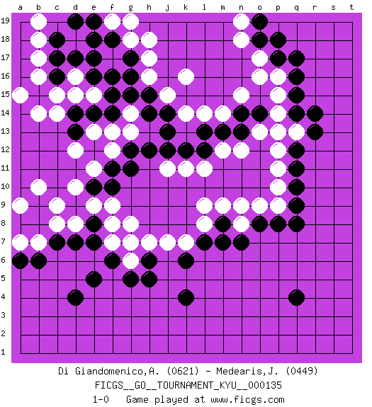 Last move : 1-0 2012 December 7 5:16:37 [Event "FICGS__GO__TOURNAMENT_KYU__000135"] [Site "FICGS"] [Date "2012.04.17"] [Round "1"] [Black "Di Giandomenico,Alfonso"] [White "Medearis,John"] [Result "1-0"] [Rating 1 "0621"] [Rating 2 "0449"] 1.d4 p16 2.k4 c15 3.q4 d10 4.q10 k16 5.q15 p14 6.q14 q13 7.q12 p13 8.r13 p9 9.q9 p11 10.q11 m9 11.m8 l8 12.m7 l9 13.l7 g8 14.g7 h7 15.h6 g6 16.g5 f7 17.f6 g7 18.h5 k7 19.k6 j7 20.d9 e9 21.e8 d8 22.e7 c9 23.c7 c8 24.d7 b10 25.e5 b7 26.b6 a7 27.a6 a9 28.p17 o17 29.q17 o16 30.o18 n18 31.o19 n19 32.p18 p15 33.p8 o9 34.o8 n8 35.n7 n9 36.q8 p12 37.q16 p10 38.r14 f8 39.c16 d16 40.c17 d18 41.c18 b16 42.b15 a15 43.d17 b14 44.e18 b18 45.d19 f19 46.f18 g18 47.e16 d15 48.f16 f17 49.g17 g19 50.e17 b17 51.g16 h18 52.e19 b19 53.h15 h16 54.g15 h17 55.f14 e15 56.h14 g13 57.j13 j15 58.j14 k14 59.h12 f13 60.g12 f12 61.g11 j11 62.j12 k11 63.k12 l11 64.l12 m12 65.l13 l14 66.m13 m14 67.n13 n12 68.n14 n15 69.o14 o13 70.f10 f9 71.e10 e11 72.f11 d12 73.e14 e13 74.d14 c14 75.d13 g14 76.f15 1-0 Here are the names of the openings (joseki) played in the four corners : Corner q16 : p16 q15 Takamoku (Gomok, Gaomu`) 5-4 Point. The takamoku (high) point (5-4). With its emphasis on influence, the 5-4 point complements the 4-4 (hoshi) point in creating an influence-oriented fuseki. Corner q4 : q4 p9 Hoshi (Hwajeom, Seongjeom, Xingwei`) 4-4 Point. The star or hoshi (4-4) point, emphasizing influence at the potential expense of territory. Corner d4 : d4 g8 Hoshi (Hwajeom, Seongjeom, Xingwei`) 4-4 Point. The star or hoshi (4-4) point, emphasizing influence at the potential expense of territory. Corner d16 : c15 c16 Mokuhazushi (Waemok, Wai`mu`) 5-3 Point. The mokuhazushi (5-3) point was popular in the Edo period in Japan (1600 - 1867). It emphasizes influence; territorially, it is inferior to the 3-4 point. Player Black won this Go (weiqi, baduk) game. Follow this game move after move (download)Use a wall to attack, not to make territory. (Anonymous) A proverb is a short sentence based on long experience. (Miguel de Cervantes)