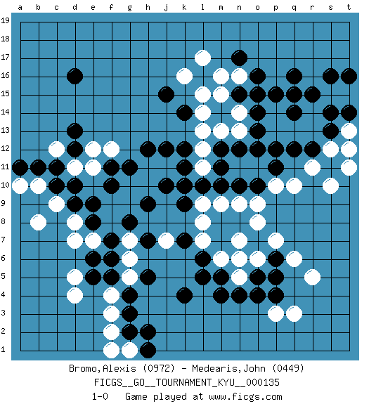 Last move : 1-0 2012 August 23 6:28:47 [Event "FICGS__GO__TOURNAMENT_KYU__000135"] [Site "FICGS"] [Date "2012.04.17"] [Round "1"] [Black "Bromo,Alexis"] [White "Medearis,John"] [Result "1-0"] [Rating 1 "0972"] [Rating 2 "0449"] 1.q16 d4 2.d16 q3 3.k10 q10 4.d10 k16 5.k4 r5 6.p5 p7 7.p6 q6 8.p4 p3 9.o4 d7 10.e8 c9 11.e5 f3 12.g4 f4 13.f5 d5 14.e6 q13 15.q14 p14 16.p15 r14 17.q15 p13 18.o14 l13 19.k12 n13 20.o13 l11 21.m10 n11 22.o12 o11 23.p12 r13 24.q12 s12 25.r12 r11 26.p11 p10 27.n12 n14 28.n15 l14 29.k14 l15 30.j15 n16 31.o16 m15 32.o15 l17 33.n17 m16 34.m12 l12 35.m11 m13 36.o10 o9 37.n10 n7 38.n6 m6 39.m5 o6 40.o5 n5 41.n4 n6 42.l6 l8 43.k7 l7 44.l5 m9 45.l10 l9 46.k9 n9 47.r15 s15 48.s16 t14 49.t16 t15 50.s11 s10 51.m4 o8 52.s13 t13 53.s14 t11 54.t12 t13 55.t14 t12 56.g3 f2 57.g2 g1 58.h1 f1 59.h2 d8 60.d9 b8 61.c10 b10 62.b11 a10 63.a11 c12 64.c11 f12 65.d12 e7 66.f7 g6 67.f6 f8 68.e9 f9 69.f10 e11 70.f11 e12 71.g8 g9 72.h9 g10 73.g11 h10 74.j10 h11 75.h12 d11 76.d13 j11 77.k11 g7 78.j12 g5 79.h5 j7 80.h7 1-0 Here are the names of the openings (joseki) played in the four corners : Corner q16 : q16 q13 Hoshi (Hwajeom, Seongjeom, Xingwei`) 4-4 Point. The star or hoshi (4-4) point, emphasizing influence at the potential expense of territory. Niken Takagakari (Dukan Nop'dakeolch'im, E`r Gaojia, 2-Space High Approach). White 2 is a light approach move. Rarely played in even games, White 2 is typically employed in handicap games. Black continues with 6-4 or 3-10. In Korean Sunjang Baduk Black has a stone on 8-4. Player Black won this Go (weiqi, baduk) game. Follow this game move after move (download)Fighting must not be the key to go, it should be reserved as your last resource. (Zhong-Pu Liu, about Weiqi) Success without honor is an unseasoned dish; it will satisfy your hunger, but it won't taste good. (Joe Paterno)