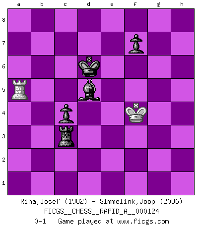 Last move : 0-1 2012 April 28 16:26:40 [Event "FICGS__CHESS__RAPID_A__000124"] [Site "FICGS"] [Date "2012.04.17"] [Round "1"] [White "Riha,Josef"] [Black "Simmelink,Joop"] [Result "0-1"] [WhiteElo "1982"] [BlackElo "2086"] 1.e4 e5 2.Nf3 Nc6 3.Bb5 a6 4.Ba4 Nf6 5.O-O Be7 6.Re1 b5 7.Bb3 O-O 8.c3 d5 9.exd5 Nxd5 10.Nxe5 Nxe5 11.Rxe5 c6 12.d4 Bd6 13.Re1 Qh4 14.g3 Qh3 15.Be3 h5 16.Nd2 Bg4 17.Nf3 Be7 18.Bc1 Rfe8 19.Qd3 h4 20.Bd2 hxg3 21.fxg3 Bf6 22.Ng5 Bxg5 23.Bxg5 Qh5 24.Qd2 Be2 25.a4 Nb6 26.axb5 cxb5 27.Qf4 Nc4 28.Qh4 Qg6 29.Bf4 Bf3 30.Bxc4 bxc4 31.Qh3 Bc6 32.Qf1 Re4 33.Red1 Qe6 34.Rd2 Re8 35.h3 Qd5 36.Rh2 Bb7 37.Rb1 R8e6 38.Rd1 g5 39.Bd2 Kg7 40.Be1 a5 41.Bd2 Rf6 42.Qg2 Qb5 43.Bc1 Re7 44.Qd2 Rf3 45.Qxg5+ Qxg5 46.Bxg5 Rxg3+ 47.Kf1 Rxg5 48.h4 Rg4 49.d5 Re5 50.Re2 Rh5 51.Red2 Rgxh4 52.Kf2 Kf6 53.Kg3 Rh3+ 54.Kf2 Ke5 55.Re2+ Kd6 56.Rf1 Rh2+ 57.Ke1 Rxe2+ 58.Kxe2 Rh2+ 59.Ke3 Bxd5 60.Kf4 Rxb2 61.Ra1 Rb3 62.Rxa5 Rxc3 0-1 Comment by player 2 : Joop Simmelink : thanks for the game! Ruy Lopez : Closed, 7...O-O Kingside Castling by player White (move 5) Kingside Castling by player Black (move 7) 10 pieces endgame at move 59 : White KRPP , Black KRBPPP WHITE : King + 1 Rook 2 Pawns BLACK : King + 1 Rook 1 Bishop 3 Pawns 9 pieces endgame at move 60 : White KRP , Black KRBPPP WHITE : King + 1 Rook 1 Pawn BLACK : King + 1 Rook 1 Bishop 3 Pawns 8 pieces endgame at move 62 : White KRP , Black KRBPP WHITE : King + 1 Rook 1 Pawn BLACK : King + 1 Rook 1 Bishop 2 Pawns 7 pieces endgame at move 62 : White KR , Black KRBPP WHITE : King + 1 Rook BLACK : King + 1 Rook 1 Bishop 2 Pawns Player Black won this chess game. Follow this game move after move (download)The laws of Chess do not permit a free choice: you have to move whether you like it or not. (Emanuel Lasker) Die Auseinandersetzung mit Karpow war politisch geprägt. Er stand für das kommunistische System, wurde von dessen Repräsentanten gehätschelt. Ich war der Oppositionelle. Jeder Schachweltmeister spiegelt auch die gesellschaftlichen Verhältnisse wider. Kramnik steht für die Börsen-Generation des Neuen Markts, ideologiefrei, zahlenfixiert. (Garry Kasparov) No puedes jugar al Ajedrez si eres de corazón noble. (Proverbio Francés) Je ne suis pas le dernier à jouer lâchement des coups douteux pendant le zeïtnot de l'adversaire pour l'achever: en effet les coups qui font le plus peur sont ceux que l'on ne comprend pas. Je me fais souvent peur quand je joue. (Un professeur anonyme) Chess, like love, like music, has the power to make people happy. (Siegbert Tarrasch)
