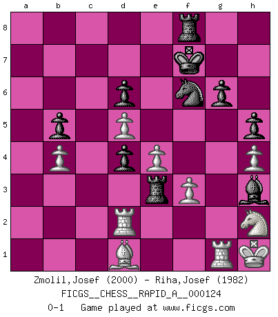 Last move : 0-1 2012 October 28 8:48:38 [Event "FICGS__CHESS__RAPID_A__000124"] [Site "FICGS"] [Date "2012.04.17"] [Round "1"] [White "Zmolil,Josef"] [Black "Riha,Josef"] [Result "0-1"] [WhiteElo "2000"] [BlackElo "1982"] 1.e4 e5 2.Nf3 Nc6 3.Bb5 a6 4.Ba4 Nf6 5.O-O Be7 6.Re1 b5 7.Bb3 d6 8.c3 O-O 9.h3 Na5 10.Bc2 c5 11.d4 Qc7 12.Nbd2 cxd4 13.cxd4 Nc6 14.a3 Bd7 15.d5 Na5 16.Nf1 Rac8 17.Bd3 Qb8 18.Ne3 Qa7 19.b4 Nc4 20.a4 Qc7 21.axb5 axb5 22.Qc2 Nb6 23.Qe2 Na4 24.Bd2 Qb7 25.Ra2 Nh5 26.Nd1 g6 27.Bh6 Rfe8 28.Qd2 Bf8 29.g4 Nf6 30.Bxf8 Rxf8 31.Qh6 Nc3 32.Nxc3 Rxc3 33.Qd2 Qc8 34.Nh2 h5 35.g5 Nh7 36.h4 f6 37.gxf6 Nxf6 38.f3 Qc7 39.Kh1 Rb3 40.Rc1 Qb6 41.Rg1 Kf7 42.Bc2 Re3 43.Bd1 Qd4 44.Qxd4 exd4 45.Rd2 Bh3 0-1 Ruy Lopez : Closed Kingside Castling by player White (move 5) Kingside Castling by player Black (move 8) Player Black won this chess game. Follow this game move after move (download)The passed pawn is a criminal, who should be kept under lock and key. Mild measures, such as police surveillance, are not sufficient. (Nimzovitch) Ich habe kein Problem mit Frauen, sondern nur mit dem Niveau ihres Schachspiels (Judith Polgar) El Ajedrez es una guerra en un tablero. El objetivo es aplastar la mente del oponente. (Bobby Fischer) Shah mat. Le roi est mort. Cri de fierté d'un joueur venant de terrasser son adversaire, courtoisement, sans effusion de sang. May the force be with you. (Han Solo in Star Wars ep.4)