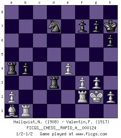 Last move : 1/2-1/2 2012 September 27 23:24:55 [Event "FICGS__CHESS__RAPID_A__000124"] [Site "FICGS"] [Date "2012.04.17"] [Round "1"] [White "Hallqvist,Niklas"] [Black "Valentin,Florea"] [Result "1/2-1/2"] [WhiteElo "1908"] [BlackElo "1917"] 1.d4 Nf6 2.g3 d5 3.Nf3 c5 4.Bg2 cxd4 5.O-O h6 6.Bf4 Nc6 7.Nxd4 e6 8.c4 Bc5 9.Nb3 Bb6 10.Nc3 O-O 11.cxd5 exd5 12.Bxd5 Bh3 13.Bg2 Qc8 14.Qd3 Rd8 15.Bxh3 Qxh3 16.Qf3 Rd7 17.Na4 Rad8 18.Qg2 Qh5 19.Nxb6 axb6 20.e4 Ng4 21.f3 Nge5 22.Qe2 Nd3 23.Be3 Qb5 24.Nc1 Qxb2 25.Qxb2 Nxb2 26.Bxb6 Ra8 27.Nb3 Nc4 28.Bf2 b5 29.Bc5 N6e5 30.Rf2 Rd3 31.Raf1 Nd7 32.Bd4 Na5 33.Nxa5 Rxa5 34.Ba1 b4 35.Rb1 Ra4 36.Kg2 Kh7 1/2-1/2 Queen's pawn game Kingside Castling by player White (move 5) Kingside Castling by player Black (move 10) This chess game ended in a draw. Follow this game move after move (download)Fischer is completely natural. He plays no roles. He's like a child. Very, very simple. (Zita Rajcsanyi) Schach ist eine Sache der genauen Beurteilung, wann man zuschlagen und wann man sich ducken muss. (Robert James Fischer) Robert Fischer es la ley hacia si mismo. (Larry Evans) Karpov est une pièce de musée. (Garry Kasparov) If you are good, you will be assigned all the work. If you are really good, you will get out of it. (Dan Rotaru)