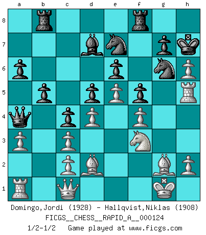 Last move : 1/2-1/2 2012 June 2 19:41:22 [Event "FICGS__CHESS__RAPID_A__000124"] [Site "FICGS"] [Date "2012.04.17"] [Round "1"] [White "Domingo,Jordi"] [Black "Hallqvist,Niklas"] [Result "1/2-1/2"] [WhiteElo "1928"] [BlackElo "1908"] 1.e4 e6 2.d4 d5 3.Nc3 Bb4 4.e5 c5 5.a3 Bxc3+ 6.bxc3 Qa5 7.Bd2 Ne7 8.Nf3 Nbc6 9.Be2 O-O 10.O-O Qa4 11.Qb1 c4 12.Nh4 Rb8 13.f4 b5 14.Rf3 Qa5 15.Qe1 Bd7 16.Rh3 a6 17.Nf3 h6 18.g4 Qa4 19.Qc1 Ng6 20.Rh5 Nce7 21.Bf1 f6 22.Bg2 f5 23.g5 Kh7 24.gxh6 1/2-1/2 French : Winawer, Advance variation Kingside Castling by player Black (move 9) Kingside Castling by player White (move 10) This chess game ended in a draw. Follow this game move after move (download)Personally, I rather look forward to a computer program winning the world Chess Championship. Humanity needs a lesson in humility. (Richard Dawkings) Ich würde mich als ganz normalen Jungen bezeichnen [Im Alter von 12]. (Sergej Karjakin) Si un gobernante no entiende al Ajedrez, ¿como puede governar él un reinado?. (El Rey Khusros II) Même un GMI sait rarement calculer sur plus de cinq coups une attaque à sacrifices. (Rudolf Spielmann) Crush them ! Make them suffer ! (General Grievous in Star Wars ep.3)