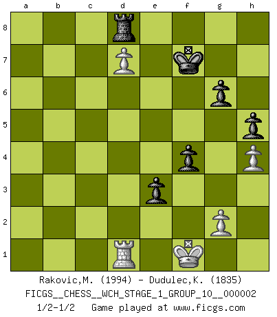 Last move : 1/2-1/2 2007 April 19 13:41:18 [Event "FICGS__CHESS__WCH_STAGE_1_GROUP_10__000002"] [Site "FICGS"] [Date "2007.01.16"] [Round "1"] [White "Rakovic,Miroslav"] [Black "Dudulec,Konstantin"] [Result "1/2-1/2"] [WhiteElo "1994"] [BlackElo "1835"] 1.e4 c5 2.c3 Nf6 3.e5 Nd5 4.d4 cxd4 5.Nf3 Nc6 6.cxd4 d6 7.Bc4 Nb6 8.Bb3 dxe5 9.d5 Na5 10.Nc3 f6 11.O-O g6 12.Be3 Bg7 13.Bc5 Nxb3 14.Qxb3 Bd7 15.a4 Qc7 16.Be3 Qc4 17.Ra3 e4 18.Nd2 Qxb3 19.Rxb3 f5 20.Bxb6 axb6 21.Rxb6 O-O 22.Rxb7 Bxa4 23.Rxe7 Rfb8 24.Nc4 Bc2 25.Rc1 Bd3 26.Ne5 Rxb2 27.f4 Bf8 28.Rc7 Rd2 29.Nd7 Bg7 30.Ne5 Bxe5 31.fxe5 f4 32.Nb1 Bxb1 33.Rxb1 Rxd5 34.e6 e3 35.Kf1 Rd2 36.h4 h5 37.Rf7 Re8 38.Rd7 Rxd7 39.exd7 Rd8 40.Rd1 Kf7 1/2-1/2 Sicilian : Alapin's variation (2.c3) Kingside Castling by player White (move 11) Kingside Castling by player Black (move 21) This chess game ended in a draw. Follow this game move after move (download)Not only will I predict his triumph over Botvinnik, but I'll go further and say that he'll probably be the greatest Chess player that ever lived. (John Collins) Wenn du nicht weißt was du tun sollst, warte bis dein Gegner eine Idee hat. Sie wird sicher schlecht sein. (Siegbert Tarrasch) En la vida, como en el Ajedrez, los Peones propios obstruyen nuestro camino. La gran fortuna de un hombre, su comodidad, placer, hijos, libros, que deberían ayudarle a ganar, con mucha frecuencia lo ponen en Jaque Mate. (Charles Buxton) Aux échecs, l'amour-propre est satisfait quand on remporte la victoire, mais il n'y a pas de honte à être battu. (Benjamin Franklin) In theory there is no difference between theory and practice. In practice there is. (Yogi Berra)