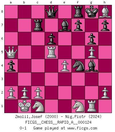 Last move : 0-1 2012 November 3 10:10:20 [Event "FICGS__CHESS__RAPID_A__000124"] [Site "FICGS"] [Date "2012.04.17"] [Round "1"] [White "Zmolil,Josef"] [Black "Nig,Piotr"] [Result "0-1"] [WhiteElo "2000"] [BlackElo "2024"] 1.e4 c5 2.Nf3 d6 3.d4 cxd4 4.Nxd4 Nf6 5.Nc3 a6 6.Be3 e5 7.Nb3 Be6 8.f3 Be7 9.Qd2 Nbd7 10.g4 O-O 11.O-O-O b5 12.g5 b4 13.Ne2 Ne8 14.Ng3 a5 15.Kb1 Nc7 16.f4 a4 17.Nc1 exf4 18.Bxf4 Nc5 19.Qxb4 Rb8 20.Qc3 Rb6 21.Rg1 g6 22.Be5 Bg4 23.Be2 Nb5 24.Bxb5 Rxb5 25.Bh8 Ne6 26.Rd5 Rb7 27.Nf1 Rc7 28.Qa5 Nf4 0-1 This chess game has been lost on time (started : 2012.04.17 19:50:52) Sicilian : Najdorf, Byrne (English) attack Kingside Castling by player Black (move 10) Queenside Castling by player White (move 11) Player Black won this chess game. Follow this game move after move (download)All my games are real. (Bobby Fischer) Korrekt heißt in Deutschland die Haltung eines Mannes, dessen Benehmen nach dem Urteile seiner Nachbarn seiner Stellung angemessen ist. Um korrekt zu sein, muß man sich der Meinung der anderen anpassen... (Emanuel Lasker) El Ajedrez detiene a su maestro dentro de sus propios vínculos, encadenando la mente y el cerebro, por lo que la libertad interior del mas fuerte debe sufrir. (Albert Einstein) Nous sommes les pions de la mystérieuse partie d'Echecs jouée par Dieu. Il nous déplace, nous arrête, nous pousse encore, puis nous lance un à un dans la boîte du Néant. Epitaphe sur la tombe de David Janowsky (1868-1927). If you have any trouble condescending, find a Unix user to show you how it's done. (Scott Adams)
