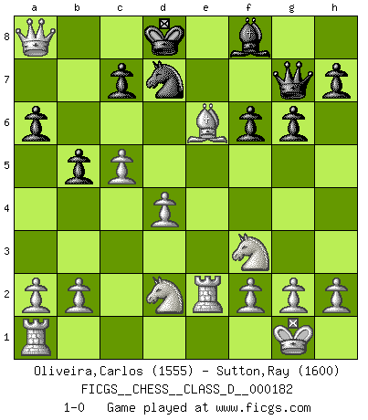Last move : 1-0 2012 May 1 1:41:10 [Event "FICGS__CHESS__CLASS_D__000182"] [Site "FICGS"] [Date "2012.04.17"] [Round "1"] [White "Oliveira,Carlos"] [Black "Sutton,Ray"] [Result "1-0"] [WhiteElo "1555"] [BlackElo "1600"] 1.e4 Nf6 2.e5 Nd5 3.d4 d6 4.c4 Nb6 5.exd6 Qxd6 6.c5 Qe6+ 7.Be2 Nd5 8.Nf3 g6 9.O-O Nf4 10.Bxf4 Qf6 11.Be5 Qe6 12.Bxh8 f6 13.Re1 a6 14.Nbd2 Qg8 15.Bxf6 exf6 16.Bc4 Be6 17.Rxe6+ Kd7 18.Re2 Qg7 19.Qb3 b5 20.Be6+ Kd8 21.Qd5+ Nd7 22.Qxa8+ 1-0 Alekhine's defense : Exchange variation Kingside Castling by player White (move 9) Player White won this chess game. Follow this game move after move (download)Fischer prefers to enter Chess history alone. (Miguel Najdorf) Am wohlsten fühle ich mich, wenn ich sehe, wie sich mein Gegner im Todeskampf windet. (Robert James Fischer) Personalmente, yo prefiero mirar hacia el futuro en donde un programa de computadora gane el título mundial de Ajedrez. La humanidad necesita una lección de humildad. (Richard Dawkings) Une platitude souvent récitée à propos des Echecs est qu'une des choses les plus difficiles à réaliser est de gagner une position gagnante. Cela ne manque pas de sens mais, pour ma part, j'ai toujours trouvé plus difficile de gagner une position perdante. (Tim Krabbe) Go and wake up your luck. (Persian saying)