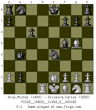 Last move : 0-1 2012 April 29 14:59:5 [Event "FICGS__CHESS__CLASS_D__000182"] [Site "FICGS"] [Date "2012.04.17"] [Round "1"] [White "Drus,Michal"] [Black "Oliveira,Carlos"] [Result "0-1"] [WhiteElo "1400"] [BlackElo "1555"] 1.e4 c6 2.d4 d5 3.Nc3 dxe4 4.Nxe4 Bf5 5.Nc5 e5 6.Nxb7 Qb6 7.Nc5 exd4 8.Nd3 Nf6 9.Bg5 Ne4 10.Qe2 Bb4+ 11.c3 dxc3 12.Nxb4 Qxb4 13.Rd1 cxb2 0-1 Caro-Kann : Classical variation Player Black won this chess game. Follow this game move after move (download)What would Chess be without silly mistakes ? (Kurt Richter) Bobby Fischer ist kein Vorbild für die heutige Jugend. (Viktor Kortschnoi) Robert Fischer es la ley hacia si mismo. (Larry Evans) Tout change constamment, y compris dans le monde des Echecs. (Botvinnik) There is no instance of a country having benefited from prolonged warfare. (Sun Tzu)