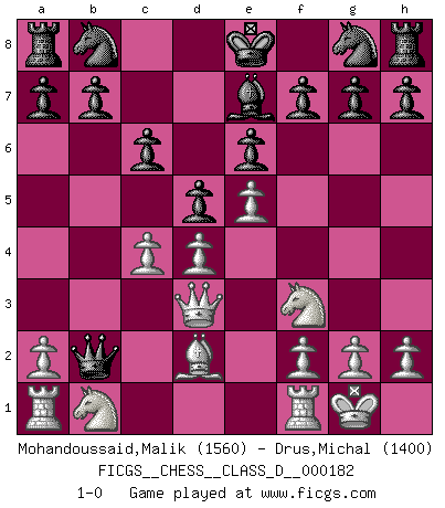 Last move : 1-0 2012 August 22 13:58:14 [Event "FICGS__CHESS__CLASS_D__000182"] [Site "FICGS"] [Date "2012.04.17"] [Round "1"] [White "Mohandoussaid,Malik"] [Black "Drus,Michal"] [Result "1-0"] [WhiteElo "1560"] [BlackElo "1400"] 1.e4 c6 2.d4 d5 3.e5 Bf5 4.Bd3 Bxd3 5.Qxd3 e6 6.Nf3 Bb4+ 7.Bd2 Qb6 8.c3 Be7 9.O-O Qxb2 10.c4 1-0 This chess game has been lost on time (started : 2012.04.17 23:19:57) Caro-Kann : Advance variation Kingside Castling by player White (move 9) Player White won this chess game. Follow this game move after move (download)A big shock; the best chess player in history has passed away. (Lajos Portisch, about Bobby Fischer's death) In Buenos Aires ist es nicht mein vorrangiges Ziel ein starkes Turnier zu organisieren, sondern ein Turnier für Gentlemen. Ich würde nie Kamsky einladen. Ich mag keine Probleme. (Miguel Najdorf) Una victoria por una combinación errónea, aunque sea espectacular, me llena de horror artístico. (Wilhelm Steinitz) Les échecs, c'est la lutte contre l'erreur. (Johannes Zukertort) Every now and then a man's mind is stretched by a new idea and never shrinks back to its former dimensions. (Oliver Wendell Holmes, Sr.)