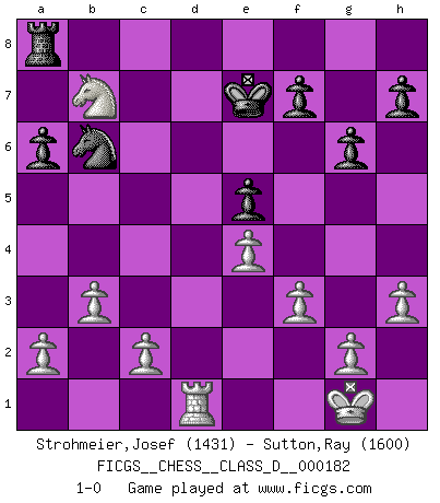 Last move : 1-0 2012 August 6 23:46:3 [Event "FICGS__CHESS__CLASS_D__000182"] [Site "FICGS"] [Date "2012.04.17"] [Round "1"] [White "Strohmeier,Josef"] [Black "Sutton,Ray"] [Result "1-0"] [WhiteElo "1431"] [BlackElo "1600"] 1.e4 c5 2.Nf3 d6 3.d4 cxd4 4.Nxd4 e5 5.Nb3 a6 6.Nc3 Nf6 7.Bg5 Be7 8.Be2 O-O 9.O-O Bg4 10.Bxg4 g6 11.Bh6 Re8 12.Qd2 Nxg4 13.Nd5 Bf8 14.Bxf8 Kxf8 15.h3 Nf6 16.f3 Nbd7 17.Rad1 Nb6 18.Nxf6 Qxf6 19.Qxd6+ Kg7 20.Qxf6+ Kxf6 21.Rd6+ Re6 22.Rfd1 Nc4 23.Rxe6+ Kxe6 24.Nc5+ Ke7 25.b3 Nb6 26.Nxb7 1-0 Sicilian Kingside Castling by player Black (move 8) Kingside Castling by player White (move 9) Player White won this chess game. Follow this game move after move (download)In Chess, just as in life, today's bliss may be tomorrow's poison. (Assaic) Ich las kürzlich ein Buch von Nietzsche. Er sagte Religion verdumme nur die Menschen. Ich stimme zu. (Robert James Fischer) Algunos sacrificios son sólidos, los demás son míos. (Mikhail Tal) Même un GMI sait rarement calculer sur plus de cinq coups une attaque à sacrifices. (Rudolf Spielmann) Train yourself to let go of everything you fear to lose. (Master Yoda in Star Wars ep.3)