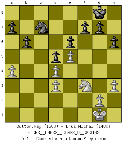 Last move : 0-1 2012 April 21 3:25:22 [Event "FICGS__CHESS__CLASS_D__000182"] [Site "FICGS"] [Date "2012.04.17"] [Round "1"] [White "Sutton,Ray"] [Black "Drus,Michal"] [Result "0-1"] [WhiteElo "1600"] [BlackElo "1400"] 1.e4 c6 2.d4 d5 3.e5 Bf5 4.Be3 e6 5.Nf3 Qb6 6.Nbd2 Qxb2 7.Bd3 Bxd3 8.cxd3 Bb4 9.O-O Ne7 10.Rb1 Qa3 11.Rb3 Qa4 12.Nb1 b6 13.Qc1 Nf5 14.Nc3 Bxc3 15.Qxc3 Nxe3 16.fxe3 O-O 17.a3 Na6 18.Rfb1 c5 19.h3 Rac8 20.Qd2 h6 21.Rc3 Rc7 22.Rbc1 Rfc8 23.Qb2 cxd4 24.exd4 Rxc3 25.Rxc3 Rxc3 26.Qxc3 Qd7 27.a4 Qc7 28.Qxc7 Nxc7 0-1 Caro-Kann : Advance variation Kingside Castling by player White (move 9) Kingside Castling by player Black (move 16) Player Black won this chess game. Follow this game move after move (download)Of Chess it has been said that life is not long enough for it, but that is the fault of life, not Chess. (William Ewart Napier) Schach ist ein Reich, wo sich die menschliche Phantasie frei entfalten kann. (David Bronstein) Fischer es una tragedia del Ajedrez Americano a la par con Morphy y Pillsbury. (Mig Greengard) Les échecs sont un jeu terrible. Si vous n'avez pas le centre, votre adversaire a une position plus libre. Par contre, si vous avez le centre, alors vous avez vraiment quelque chose pour laquelle vous inquiéter ! (Siegbert Tarrasch) Yoga is 99% practice and 1% knowledge. (Sri Krishna Pattabhi Jois)