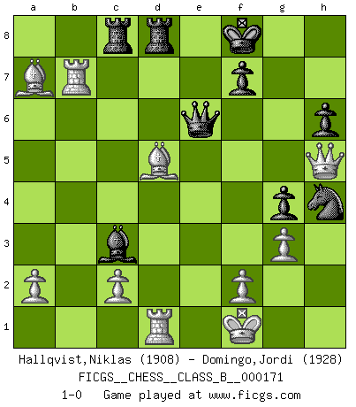 Last move : 1-0 2012 November 20 18:52:50 [Event "FICGS__CHESS__CLASS_B__000171"] [Site "FICGS"] [Date "2012.04.18"] [Round "1"] [White "Hallqvist,Niklas"] [Black "Domingo,Jordi"] [Result "1-0"] [WhiteElo "1908"] [BlackElo "1928"] 1.g3 g5 2.Bg2 Bg7 3.d4 h6 4.h4 g4 5.e4 d6 6.Ne2 e5 7.Be3 Nc6 8.O-O exd4 9.Nxd4 Nge7 10.Nc3 Ne5 11.b3 a6 12.Rb1 c5 13.Nf5 Nxf5 14.exf5 Bxf5 15.Ne4 Bxe4 16.Bxe4 Qd7 17.Qd5 Qc6 18.Rfd1 Ke7 19.b4 c4 20.Qd4 Qc7 21.Kg2 Rab8 22.b5 axb5 23.Rxb5 Rhd8 24.Qb2 Qd7 25.Ba7 Nf3 26.Qb4 Bc3 27.Qxc4 Rbc8 28.Qd5 Qe6 29.Rxb7+ Kf8 30.Qh5 Nxh4+ 31.Kf1 d5 32.Bxd5 1-0 Benko's Opening Kingside Castling by player White (move 8) Player White won this chess game. Follow this game move after move (download)Excellence at Chess is one mark of a scheming mind. (Sir Arthur Conan Doyle) Ihnen, Herr Lasker, habe ich nur drei Worte zu sagen: Schach und matt. (Siegbert Tarrasch) El sobresalir en el Ajedrez es un signo de una mente intrigante. (Sir Arthur Conan Doyle) J'apprécie les joueurs d'est-indienne, c'est grâce à eux que je nourris ma famille depuis tant d'années. (Petrosian) Luck is the residue of design. (John Milton)