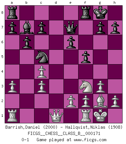 Last move : 0-1 2012 September 4 4:50:22 [Event "FICGS__CHESS__CLASS_B__000171"] [Site "FICGS"] [Date "2012.04.18"] [Round "1"] [White "Barrish,Daniel"] [Black "Hallqvist,Niklas"] [Result "0-1"] [WhiteElo "2000"] [BlackElo "1908"] 1.d4 e6 2.c4 b6 3.a3 f5 4.Nc3 Bb7 5.d5 Na6 6.g3 Nf6 7.Bg2 Nc5 8.Bg5 Be7 9.Nf3 O-O 10.O-O Nfe4 11.Bxe7 Qxe7 12.dxe6 Nxc3 13.bxc3 dxe6 0-1 Queen's pawn : Keres defense Kingside Castling by player Black (move 9) Kingside Castling by player White (move 10) Player Black won this chess game. Follow this game move after move (download)What is the difference between chess and football? Everybody understands football, but nobody plays it. Everybody plays chess, but nobody understands it. Everything is relative. (Vladimir Kramnik) Es gibt zwei Arten von Opfern: Korrekte und meine. (Mikhail Nekhemyevich Tal) Los Peones son el alma de una partida de Ajedrez. (Francois Andre Danican Philidor) On est toujours la mazette de quelqu'un d'autre. (Anonyme) Always two there are. No more no less. A master, and an apprentice. (Master Yoda in Star Wars ep.1)