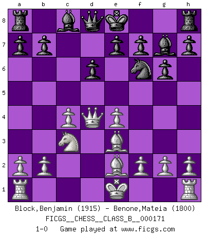 Last move : 1-0 2012 August 13 1:6:17 [Event "FICGS__CHESS__CLASS_B__000171"] [Site "FICGS"] [Date "2012.04.18"] [Round "1"] [White "Block,Benjamin"] [Black "Benone,Mateia"] [Result "1-0"] [WhiteElo "1915"] [BlackElo "1800"] 1.e4 c5 2.Nf3 Nc6 3.d4 cxd4 4.Nxd4 g6 5.c4 Nf6 6.Nc3 Nxd4 7.Qxd4 d6 8.Be2 Bg7 9.Be3 1-0 This chess game has been lost on time (started : 2012.04.18 21:44:21) Sicilian : Accelerated Fianchetto, Gurgenidze variation Player White won this chess game. Follow this game move after move (download)One bad move nullifies forty good ones. (Horowitz) Nicht daß Diemer aus Opportunismus Mitglied der NSDAP geworden wäre. Er war ein Fanatiker, in allem, was er tat. (Hans Ree) En la vida, como en el Ajedrez, los Peones propios obstruyen nuestro camino. La gran fortuna de un hombre, su comodidad, placer, hijos, libros, que deberían ayudarle a ganar, con mucha frecuencia lo ponen en Jaque Mate. (Charles Buxton) Les échecs, c'est la lutte contre l'erreur. (Johannes Zukertort) Chess is as much a mystery as women. (Purdy)