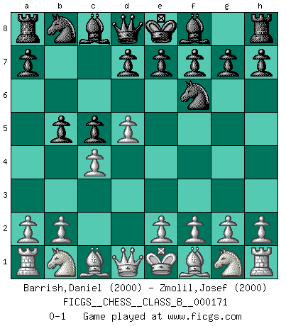 Last move : 0-1 2012 August 15 13:22:43 [Event "FICGS__CHESS__CLASS_B__000171"] [Site "FICGS"] [Date "2012.04.18"] [Round "1"] [White "Barrish,Daniel"] [Black "Zmolil,Josef"] [Result "0-1"] [WhiteElo "2000"] [BlackElo "2000"] 1.d4 Nf6 2.c4 c5 3.d5 b5 0-1 This chess game has been lost on time (started : 2012.04.18 21:44:21) Benko gambit Player Black won this chess game. Follow this game move after move (download)Do you realize Fischer almost never has any bad pieces? He exchanges them, and the bad pieces remain with his opponents. (Yuri Balashov) Ich habe die besten Aussichten, den ersten Preis zu gewinnen - denn jeder muss gegen Steinitz spielen, nur ich nicht! (Wilhelm Steinitz) Yo tuve un dolor de muelas en la primer partida. En el segundo juego, tuve un dolor de cabeza. En el tercero, tuve un ataque de reumatísmo. En la cuarta partida, no me sentía muy bien. ¿Y en el quinto juego? Bueno, ¿que acaso uno tiene que ganar todos los juegos?. (Siegbert Tarrasch) On n'a jamais que l'âge auquel on a commence à jouer aux échecs car après on cesse de vieillir. (Capablanca) You must do what you feel is right... of course. (Obi-Wan Kenobi in Star Wars ep.4)