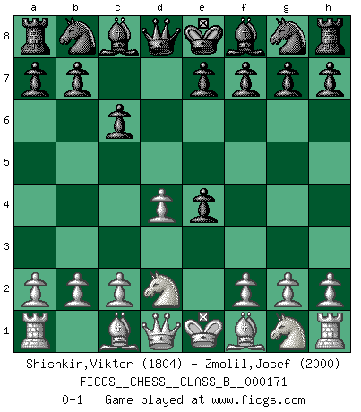 Last move : 0-1 2012 June 6 15:22:44 [Event "FICGS__CHESS__CLASS_B__000171"] [Site "FICGS"] [Date "2012.04.18"] [Round "1"] [White "Shishkin,Viktor"] [Black "Zmolil,Josef"] [Result "0-1"] [WhiteElo "1804"] [BlackElo "2000"] 1.e4 c6 2.d4 d5 3.Nd2 dxe4 0-1 This chess game has been lost on time (started : 2012.04.18 21:44:21) Caro-Kann : 3.Nd2 Player Black won this chess game. Follow this game move after move (download)Chess makes man wiser and clear-sighted. (Vladimir Putin) Wenn ich mich einlogge, glauben die Leute gewöhnlich nicht, dass ich es selbst bin und sie fangen an, mir dumme Fragen zu stellen. Und wenn sie es glauben, stellen sie wieder andere dumme Fragen. (Judith Polgar) Ciertamente el estado mental actual de Bobby Fischer es una tragedia. Uno de los mas grandes jugadores de Ajedrez del mundo -el orgullo y pena del Ajedrez Americano. (Frank Brady) Si rien de grave n'est détecté lors de l'analyse d'une position, on joue alors le coup. Seconde règle de Blumenfeld. There are two kinds of people in the world, my friend. Those who have a loaded gun and those who dig. You dig ! (Blondie in The Good, The Bad and The Ugly)
