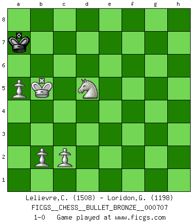 Last move : 1-0 2012 April 19 0:32:36 [Event "FICGS__CHESS__BULLET_BRONZE__000707"] [Site "FICGS"] [Date "2012.04.19"] [Round "1"] [White "Lelievre,Clement"] [Black "Loridon,Geoffroy"] [Result "1-0"] [WhiteElo "1508"] [BlackElo "1198"] 1.e4 e5 2.Nf3 Nc6 3.Bb5 f6 4.d3 a6 5.Ba4 Nh6 6.h3 Bc5 7.Nc3 g5 8.Bb3 g4 9.hxg4 Nxg4 10.d4 exd4 11.Nxd4 d6 12.Be3 Nxd4 13.Bxd4 b5 14.Bxc5 dxc5 15.Qxd8+ Kxd8 16.O-O-O Ke8 17.Rd2 c4 18.Rhd1 Be6 19.Bxc4 bxc4 20.f3 Nh2 21.Rf2 f5 22.g4 fxg4 23.Rxh2 gxf3 24.Rf2 Bg4 25.e5 h5 26.Rd4 h4 27.Rxg4 h3 28.Rh2 Kf7 29.Rf4+ Ke6 30.Rxf3 Kxe5 31.Rfxh3 Rhf8 32.Rh1 Rad8 33.Rh5+ Ke6 34.Rd1 Rxd1+ 35.Kxd1 Rd8+ 36.Ke2 Kf6 37.Rh6+ Kg7 38.Rxa6 Re8+ 39.Kd2 Rd8+ 40.Ke3 Re8+ 41.Kf4 Rf8+ 42.Ke5 Re8+ 43.Kd4 Rd8+ 44.Kxc4 Rd2 45.Kb3 Rd7 46.Ra7 Kf7 47.Nb5 Rd5 48.Rxc7+ Ke6 49.Rc6+ Kd7 50.Rc7+ Ke6 51.Nc3 Rd7 52.Rxd7 Kxd7 53.a4 Kc6 54.Kb4 Kb6 55.a5+ Ka6 56.Nd5 Ka7 57.Kb5 1-0 Ruy Lopez : Nuernberg variation Queenside Castling by player White (move 16) 10 pieces endgame at move 38 : White KRNPPP , Black KRPP WHITE : King + 1 Rook 1 Knight 3 Pawns BLACK : King + 1 Rook 2 Pawns 9 pieces endgame at move 44 : White KRNPPP , Black KRP WHITE : King + 1 Rook 1 Knight 3 Pawns BLACK : King + 1 Rook 1 Pawn 8 pieces endgame at move 48 : White KRNPPP , Black KR WHITE : King + 1 Rook 1 Knight 3 Pawns BLACK : King + 1 Rook 7 pieces endgame at move 52 : White KRNPPP , Black K WHITE : King + 1 Rook 1 Knight 3 Pawns BLACK : King + 6 pieces endgame at move 52 : White KNPPP , Black K WHITE : King + 1 Knight 3 Pawns BLACK : King + Player White won this chess game. Follow this game move after move (download)Fischer Chess play was always razor-sharp, rational and brilliant. One of the best ever. (Dave Regis) Mit Schach schule ich mein Gefühl für Geometrie, was für Tennis und Schach gleichermaßen wichtig ist. (Boris Becker) En posiciones complicadas, Bobby Fischer pocas veces tuvo que temer de cualquiera. (Paul Keres) L'attaque fait le spectacle, la défense gagne les matchs. (Dicton footballistique) History is a gallery of pictures in which there are few originals and many copies. (Alexis de Tocqueville)
