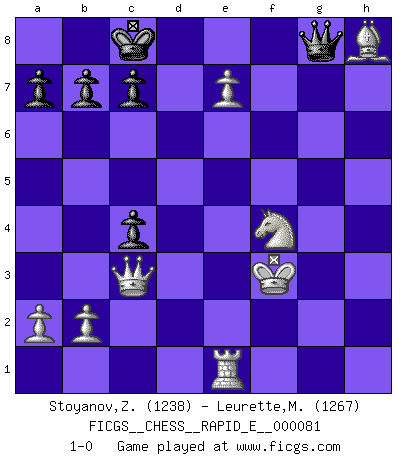 Last move : 1-0 2012 April 30 16:7:38 [Event "FICGS__CHESS__RAPID_E__000081"] [Site "FICGS"] [Date "2012.04.19"] [Round "1"] [White "Stoyanov,Zdravko"] [Black "Leurette,Marc-Antoine"] [Result "1-0"] [WhiteElo "1238"] [BlackElo "1267"] 1.e4 e5 2.Nf3 Nc6 3.Bb5 Nf6 4.Bxc6 dxc6 5.d3 h6 6.h3 c5 7.Nxe5 Be6 8.O-O Bd6 9.Nf3 Qd7 10.e5 Bxe5 11.Nxe5 Qd6 12.Re1 O-O-O 13.f4 g6 14.c4 Nd7 15.Nc3 Nxe5 16.fxe5 Qc6 17.Ne4 f5 18.Ng3 Bxc4 19.Qc2 Bxd3 20.Qc3 c4 21.Be3 h5 22.Bd4 h4 23.Ne2 g5 24.e6 Rhg8 25.e7 Rde8 26.Bf6 g4 27.g3 hxg3 28.Nf4 gxh3 29.Nxh3 g2 30.Nf4 Rg4 31.Nxd3 Qb6+ 32.Kh2 Rh8+ 33.Bxh8 Qh6+ 34.Kg1 Qh1+ 35.Kf2 g1Q+ 36.Rxg1 Qh2+ 37.Ke3 f4+ 38.Kf3 Qh3+ 39.Ke4 f3 40.Nf4 Qh7+ 41.Kxf3 Rg8 42.Rxg8+ Qxg8 43.Re1 1-0 Ruy Lopez : Berlin defense Kingside Castling by player White (move 8) Queenside Castling by player Black (move 12) Promotion Queen by player Black (move 35) Player White won this chess game. Follow this game move after move (download)Strategy requires thought, tactics require observation. (Max Euwe) Es liegt in der Natur, vernüftig zu denken und unlogisch zu handeln. (Anatole France) Un buen sacrificio es aquel que aunque no sea necesariamente sólido, deja a tu oponente aturdido y confuso. (Rudolph Spielmann) Dieu déplace le joueur, et celui-ci la pièce. Quel Dieu derrière Dieu commence donc la trame ? Arturo Perez-Reverte (prix de littérature policière 1993). The intuitive mind is a sacred gift; the rational mind is a faithful servant. We have created a society that honors the servant but has forgotten the gift. (Albert Einstein)