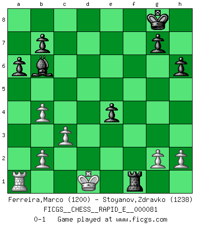 Last move : 0-1 2012 April 30 18:24:28 [Event "FICGS__CHESS__RAPID_E__000081"] [Site "FICGS"] [Date "2012.04.19"] [Round "1"] [White "Ferreira,Marco"] [Black "Stoyanov,Zdravko"] [Result "0-1"] [WhiteElo "1200"] [BlackElo "1238"] 1.e4 c5 2.Nf3 a6 3.d4 cxd4 4.Nxd4 e5 5.Nb3 d6 6.Nc3 Be6 7.Be2 Bxb3 8.axb3 Nc6 9.O-O h6 10.f4 exf4 11.Bxf4 Nf6 12.Bf3 Ne5 13.Bxe5 dxe5 14.Qxd8+ Rxd8 15.Rfd1 Bd6 16.Kf2 O-O 17.Be2 Rd7 18.Na4 Nxe4+ 19.Ke3 f5 20.Bf3 Rfd8 21.Bxe4 fxe4 22.Kxe4 Bc7 23.Rxd7 Rxd7 24.Nc5 Rd4+ 25.Ke3 Bb6 26.c3 Rg4 27.Kf3 Rf4+ 28.Ke2 Bxc5 29.b4 Bb6 30.Kd3 e4+ 31.Ke2 Rf2+ 32.Kd1 Rf1+ 0-1 Sicilian : O'Kelly variation Kingside Castling by player White (move 9) Kingside Castling by player Black (move 16) Player Black won this chess game. Follow this game move after move (download)Many have become Chess Masters, no one has become the Master of Chess. (Siegbert Tarrasch) Wie kann ich Remis annehmen? Ich weiß ja gar nicht, wie ich stehe! (Fritz Sämisch) Debemos de asegurarnos de que el Ajedrez no se convierta en un lenguaje muerto, muy interesante, pero solo para un grupo muy pequeño. (Sytze Faber) Ce qui est bien, c'est d'avoir tout un tas de pièces en prise : l'adversaire ne peut en prendre qu'une à la fois. Cité par Thierry Audin. I know the human being and fish can coexist peacefully. (George W. Bush, Saginaw sept. 29, 2000)