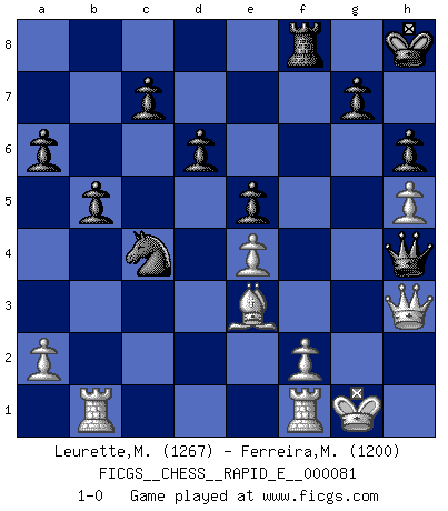 Last move : 1-0 2012 August 23 14:13:24 [Event "FICGS__CHESS__RAPID_E__000081"] [Site "FICGS"] [Date "2012.04.19"] [Round "1"] [White "Leurette,Marc-Antoine"] [Black "Ferreira,Marco"] [Result "1-0"] [WhiteElo "1267"] [BlackElo "1200"] 1.e4 e5 2.Nf3 Nc6 3.Bc4 Bc5 4.c3 Nf6 5.Ng5 O-O 6.O-O h6 7.Nf3 d6 8.h3 Be6 9.Qe2 a6 10.Bxe6 fxe6 11.d4 exd4 12.cxd4 Bxd4 13.Nc3 Bxc3 14.bxc3 e5 15.Qc4+ Kh8 16.Rb1 Na5 17.Qd3 b5 18.c4 Nxc4 19.Be3 Nh5 20.g4 Rxf3 21.gxh5 Qh4 22.Qd5 Raf8 23.Qe6 Rxh3 24.Qxh3 1-0 This chess game has been lost on time (started : 2012.04.19 8:49:10) Giuoco Piano Kingside Castling by player Black (move 5) Kingside Castling by player White (move 6) Player White won this chess game. Follow this game move after move (download)The boy (then a 12 year old boy named Anatoly Karpov) doesn't have a clue about Chess, and there's no future at all for him in this profession. (Mikhail Botvinnik) Wenn ein Kopf und ein Buch zusammenstoßen und es klingt hohl, ist es denn allemal im Buche? (Georg Christoph Lichtenberg) El Ajedrez es el arte del análisis. (Mikhail Botvinnik) Toutes choses étant égales, c'est la conviction qui gagne. Alliée à une volonté de vaincre, elle sert de détonateur, suscite des idées, disperse les doutes et aide à penser clairement. (Robert Fischer) May the force be with you. (Han Solo in Star Wars ep.4)