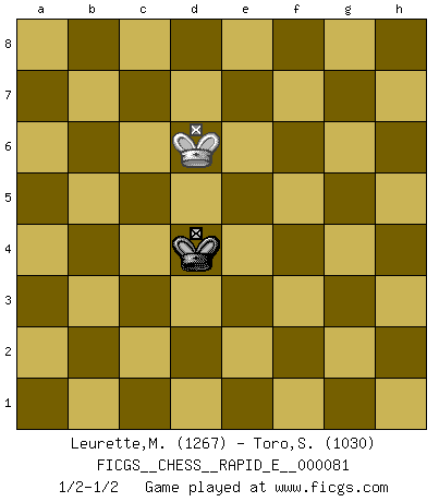 Last move : 1/2-1/2 2012 October 7 14:19:20 [Event "FICGS__CHESS__RAPID_E__000081"] [Site "FICGS"] [Date "2012.04.19"] [Round "1"] [White "Leurette,Marc-Antoine"] [Black "Toro,Simone"] [Result "1/2-1/2"] [WhiteElo "1267"] [BlackElo "1030"] 1.e4 e5 2.Nf3 Nc6 3.Bc4 Bc5 4.c3 Nf6 5.Ng5 d5 6.exd5 Nxd5 7.d4 exd4 8.O-O O-O 9.Qh5 h6 10.Ne4 Nf6 11.Nxf6+ Qxf6 12.cxd4 Nxd4 13.Qxc5 Nc2 14.Qxc7 Nxa1 15.Bd3 Bf5 16.Bxf5 Qxf5 17.Nc3 Rac8 18.Qxb7 Ra8 19.Bxh6 gxh6 20.Rxa1 Rab8 21.Qc7 Rxb2 22.Qxa7 Rfb8 23.Rf1 Qc2 24.Qd4 R8b4 25.Qe3 Rc4 26.Qg3+ Kh7 27.Nd1 Rb1 28.Ne3 Rxf1+ 29.Nxf1 Qd1 30.Qe3 Rc1 31.Qe4+ Kg8 32.Qa8+ Kg7 33.Qa6 Rc2 34.g3 Qf3 35.Qa7 Qe2 36.Kg2 Rxa2 37.Qd4+ f6 38.Qe3 Qxe3 39.Nxe3 Ra8 40.h4 Ra5 41.g4 h5 42.f3 Kg6 43.Kg3 Ra3 44.Kf4 Ra4+ 45.Kg3 Rb4 46.f4 Ra4 47.f5+ Kh6 48.Kf3 hxg4+ 49.Nxg4+ Kh5 50.Nxf6+ Kxh4 51.Ne4 Kh5 52.Kf4 Kh6 53.f6 Kg6 54.Ke5 Ra5+ 55.Ke6 Rf5 56.f7 Rxf7 57.Ke5 Re7+ 58.Kf4 Rf7+ 59.Ke5 Rf5+ 60.Kd4 Ra5 61.Nc5 Kf5 62.Kd5 Rb5 63.Kd6 Rb6+ 64.Kd5 Rb5 65.Kd6 Rb1 66.Ke7 Re1+ 67.Kd6 Rd1+ 68.Ke7 Ke5 69.Ne6 Re1 70.Nd8 Kd5 71.Kd7 Rd1 72.Nf7 Ke4 73.Ke6 Rd5 74.Nd6+ Rxd6+ 75.Kxd6 Kd4 76.Kc6 Kc4 77.Kd6 Kd4 78.Ke6 Ke4 79.Kd6 Kd4 1/2-1/2 Giuoco Piano Kingside Castling by player White (move 8) Kingside Castling by player Black (move 8) 10 pieces endgame at move 38 : White KNPPP , Black KQRPP WHITE : King + 1 Knight 3 Pawns BLACK : King + 1 Queen 1 Rook 2 Pawns 9 pieces endgame at move 39 : White KNPPP , Black KRPP WHITE : King + 1 Knight 3 Pawns BLACK : King + 1 Rook 2 Pawns 8 pieces endgame at move 48 : White KNPP , Black KRPP WHITE : King + 1 Knight 2 Pawns BLACK : King + 1 Rook 2 Pawns 7 pieces endgame at move 49 : White KNPP , Black KRP WHITE : King + 1 Knight 2 Pawns BLACK : King + 1 Rook 1 Pawn 6 pieces endgame at move 50 : White KNPP , Black KR WHITE : King + 1 Knight 2 Pawns BLACK : King + 1 Rook 5 pieces endgame at move 50 : White KNP , Black KR WHITE : King + 1 Knight 1 Pawn BLACK : King + 1 Rook 4 pieces endgame at move 56 : White KN , Black KR WHITE : King + 1 Knight BLACK : King + 1 Rook 3 pieces endgame at move 74 : White K , Black KR WHITE : King + BLACK : King + 1 Rook 2 pieces endgame at move 75 : White K , Black K WHITE : King + BLACK : King + This chess game ended in a draw. Follow this game move after move (download)Could we look into the head of a Chess player, we should see there a whole world of feelings, images, ideas, emotion and passion. (Alfred Binet) Der Knackpunkt bei der Konzentration ist, daß wir nur durch sie etwas Neues und Ungewöhnliches am Schachbrett finden können. Sie ist der einzige Weg durch neue neue Ideen eine Überraschung zu bereiten. (Garry Kasparov) La estratégia requiere pensar, la táctica requiere observación. (Max Euwe) Un millionnaire : 'Monsieur Steinitz ! Vous ne participez aux tournois que pour l'argent, alors que moi je n'y viens que pour l'honneur.' Steinitz : 'Chacun joue pour ce qu'il n'a pas'... Is not life a hundred times too short to bore ourselves ? (Friedrich Nietzsche)