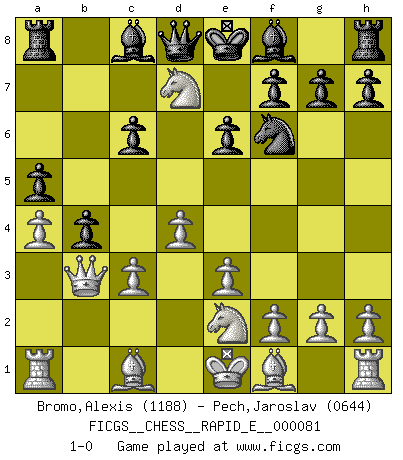 Last move : 1-0 2012 August 13 1:6:17 [Event "FICGS__CHESS__RAPID_E__000081"] [Site "FICGS"] [Date "2012.04.19"] [Round "1"] [White "Bromo,Alexis"] [Black "Pech,Jaroslav"] [Result "1-0"] [WhiteElo "1188"] [BlackElo "0644"] 1.d4 d5 2.c4 c6 3.Nc3 Nf6 4.Nf3 dxc4 5.e3 b5 6.a4 b4 7.Ne2 e6 8.Ne5 c3 9.bxc3 a5 10.Qb3 Nbd7 11.Nxd7 1-0 This chess game has been lost on time (started : 2012.04.19 8:49:10) QGD Slav defense Player White won this chess game. Follow this game move after move (download)The older I grow, the more I value Pawns. (Keres) Ich brauche nur einen Blick auf das Schachbrett zu werfen, und weiß schon, was in der Stellung steckt, was geschehen kann und was geschehen wird. Alle übrigen suchen und prüfen, ich aber weiß es! (José Raúl Capablanca) Yo adoro todas la posiciones. Denme una partida posicional difícil, y la jugaré. Pero posiciones totalmente ganadas, no las tolero. (Hein Donner) Le joueur d'Echecs qui veut atteindre le top est obligé de développer son propre credo créatif. Alexeï Stepanovicth Souétine. Il est facile d'écrire des livres ! Ce qui est difficile, c'est de jouer ! (Alexeï Stepanovicth Souétine) Programming can only do so much before it becomes too much. (Don Groves)
