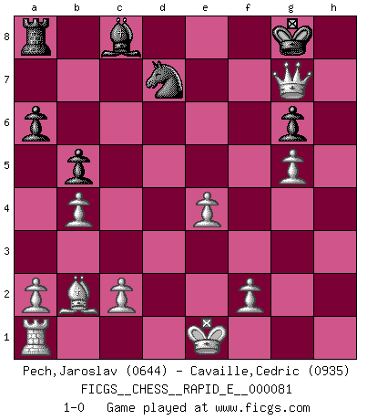 Last move : 1-0 2012 August 27 20:28:43 [Event "FICGS__CHESS__RAPID_E__000081"] [Site "FICGS"] [Date "2012.04.19"] [Round "1"] [White "Pech,Jaroslav"] [Black "Cavaille,Cedric"] [Result "1-0"] [WhiteElo "0644"] [BlackElo "0935"] 1.e4 c5 2.Nf3 d6 3.d4 cxd4 4.Nxd4 Nf6 5.Nc3 e6 6.g4 Be7 7.g5 Nfd7 8.h4 g6 9.h5 Nc6 10.hxg6 fxg6 11.Nxe6 Qb6 12.Nd5 Qa5+ 13.b4 Qa4 14.Bb5 Qxb5 15.Nec7+ Kd8 16.Nxb5 a6 17.Nxe7 Nxe7 18.Nxd6 b5 19.Nf7+ Ke8 20.Nxh8 Kf8 21.Rxh7 Kg8 22.Qd6 Kxh7 23.Qxe7+ Kxh8 24.Bb2+ Kg8 25.Qg7+ 1-0 Sicilian : Scheveningen, Keres attack Player White won this chess game. Follow this game move after move (download)We like to think. (Gary Kasparov) Schach ist das Spiel, das die Verrückten gesund hält. (Albert Einstein) Mi estilo es algo parecido entre un poco de Tal y Petrosian. (Reshevsky) Il n'y a pas eu de défaite parce que je ne crois pas que cet ordinateur ait jamais existé. IBM a triché en refusant d'imprimer les modes de recherche de la machine. C'est évident, pendant le match, des coups décisifs ont été joués par des êtres humains. Aujourd'hui, les meilleurs spécialistes en informatique ne peuvent toujours pas expliquer comment Deep-Blue a pu jouer contre la logique des ordinateurs. IBM a gagné une guerre de communication, mais ils sont incapables de prouver que l'ordinateur a gagné tout seul. (Garry Kasparov) You cannot beat a roulette table unless you steal money from it. (Albert Einstein)