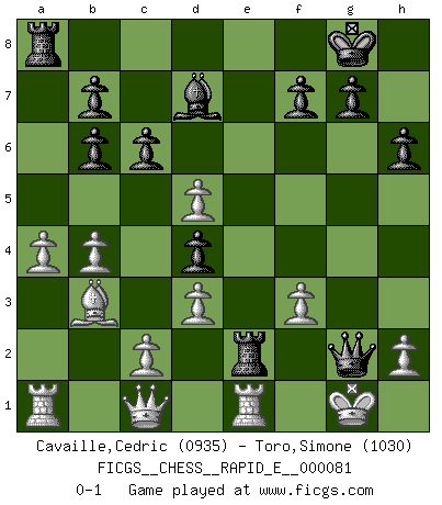 Last move : 0-1 2012 May 5 17:9:10 [Event "FICGS__CHESS__RAPID_E__000081"] [Site "FICGS"] [Date "2012.04.19"] [Round "1"] [White "Cavaille,Cedric"] [Black "Toro,Simone"] [Result "0-1"] [WhiteElo "0935"] [BlackElo "1030"] 1.e4 e5 2.Nf3 Nc6 3.Bc4 Bc5 4.d3 Nf6 5.Nc3 O-O 6.O-O Re8 7.Qe1 d6 8.Be3 Bb6 9.Bxb6 axb6 10.a3 h6 11.b4 Nd4 12.Nxd4 exd4 13.Nd5 Nxd5 14.Bxd5 c6 15.Bb3 d5 16.f3 Qg5 17.a4 Bd7 18.Qc1 Qg6 19.exd5 Re2 20.Re1 Qxg2+ 0-1 Giuoco Pianissimo : Italian Four knights variation Kingside Castling by player Black (move 5) Kingside Castling by player White (move 6) Player Black won this chess game. Follow this game move after move (download)By playing at Chess then, we may learn: First: Foresight... Second: Circumspection... Third: Caution... And lastly, we learn by Chess the habit of not being discouraged by present bad appearances in the state of our affairs, the habit of hoping for a favorable chance, and that of persevering in the secrets of resources. (Benjamin Franklin) Moralische Siege zählen nicht. (Savielly Grigorievitsch Tartakower) El ganador de una partida es aquel jugador que hace el penúltimo error. (Savielly Tartakover) Si je n'étais pas joueur d'échecs, je serais le meilleur dans quelque chose d'autre. (Anatoli Karpov) Art disturbs, science reassures. (Georges Braque, Le Jour et la Nuit)