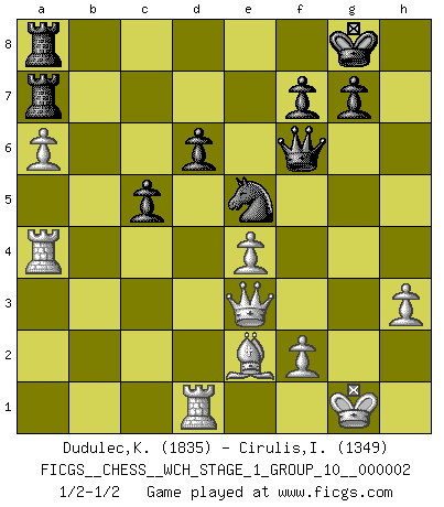 Last move : 1/2-1/2 2007 June 18 13:12:50 [Event "FICGS__CHESS__WCH_STAGE_1_GROUP_10__000002"] [Site "FICGS"] [Date "2007.01.16"] [Round "1"] [White "Dudulec,Konstantin"] [Black "Cirulis,Ilmars"] [Result "1/2-1/2"] [WhiteElo "1835"] [BlackElo "1349"] 1.Nf3 Nc6 2.e4 e5 3.d4 exd4 4.Nxd4 Bc5 5.Be3 Qf6 6.c3 Nge7 7.g3 d6 8.Bg2 O-O 9.O-O Ne5 10.h3 Nc4 11.Bc1 a5 12.Nd2 Nxd2 13.Qxd2 Nc6 14.Nb5 Bb6 15.Qe2 Be6 16.Be3 Bxe3 17.Qxe3 Qe7 18.Nd4 Rfe8 19.Rfd1 Qd7 20.Nxe6 Qxe6 21.Rd5 Ne5 22.Qd4 Nd7 23.Rd1 b6 24.Qa4 Rac8 25.b3 Nc5 26.Qc6 h6 27.R5d4 h5 28.b4 axb4 29.cxb4 Nd7 30.a4 h4 31.gxh4 Ne5 32.Qc3 Qh6 33.a5 bxa5 34.bxa5 Qxh4 35.a6 Ra8 36.Ra4 Ra7 37.Qe3 Rea8 38.Bf1 Qf6 39.Be2 c5 1/2-1/2 Reti Opening Kingside Castling by player Black (move 8) Kingside Castling by player White (move 9) This chess game ended in a draw. Follow this game move after move (download)I have always a slight feeling of pity for the man who has no knowledge of Chess. (Siegbert Tarrasch) Im Schach gibt es keinen Platz für Galanterie. (Irving Chernev) Una buena ofensiva y una buena defensa, comienzan ambas con un buen desarrollo. (Bruce A. Moon) La solitude du joueur d'Echecs à l'approche du mat est semblable à celle du condamné. (Francis Szpiner) All men can see these tactics whereby I conquer, but what none can see is the strategy out of which victory is evolved. (Sun Tzu)