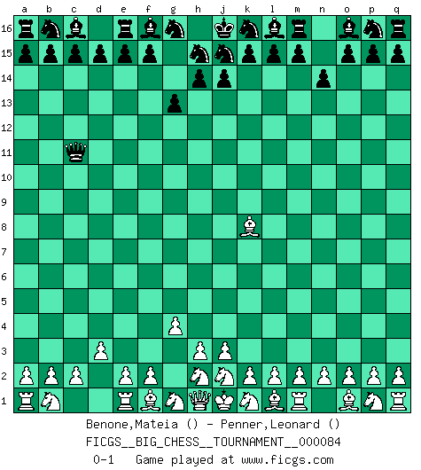 Last move : 0-1 2012 August 20 1:40:47 [Event "FICGS__BIG_CHESS__TOURNAMENT__000084"] [Site "FICGS"] [Date "2012.04.20"] [Round "1"] [White "Benone,Mateia"] [Black "Penner,Leonard"] [Result "0-1"] [WhiteElo ""] [BlackElo ""] 1.g2-g4 n15-n14 2.d2-d3 g15-g13 3.c1-k8 h16-c11 0-1 This big chess game has been lost on time (started : 2012.04.20 5:30:35) Follow this game move after move (download)The Pawns are the soul of the game. (Francois Andre Danican Philidor) Sicherlich können nur Meister einen Stil haben. Daß ein nicht-Meister auch nur ein einziges Mal in seinem Leben eine Partie folgerecht durchführte, habe ich niemals bemerkt. (Emanuel Lasker) Las ideas audaces son como las piezas del Ajedrez que avanzan hacia adelante. Ellas pueden ser vencidas, pero también pueden iniciar una partida victoriosa. (Goethe) L'ordinateur a tué l'originalité. Il n'y a plus guère d'aventures sur l'échiquier. (Jacob Murray) When you stop learning you start dying. (Scott Adams)