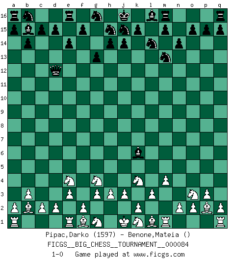 Last move : 1-0 2012 August 20 13:42:51 [Event "FICGS__BIG_CHESS__TOURNAMENT__000084"] [Site "FICGS"] [Date "2012.04.20"] [Round "1"] [White "Pipac,Darko"] [Black "Benone,Mateia"] [Result "1-0"] [WhiteElo "1597"] [BlackElo ""] 1.j2-k4 g15-g13 2.h1-o7 h16-f14 3.h2-g4 p16-o14 4.o7-c7 k16-l14 5.c7-l15 e15-e14 6.e2-e3 b15-b14 7.p2-p3 c16-b15 8.p1-o3 o14-m13 9.l15-c7 f16-c13 10.m2-m4 n15-n14 11.o1-p2 o16-g9 12.l2-l3 f14-d12 13.b2-b3 g9-d6 14.c7-d6 d12-d6 15.g2-g3 c13-h8 16.b1-c3 h8-k6 17.c3-e4 d6-d12 18.c1-b2 1-0 This big chess game has been lost on time (started : 2012.04.20 5:30:35) Follow this game move after move (download)There are tough players and nice guys, and I'm a tough player. (Bobby Fischer) Der beste Spieler in einem Turnier gewinnt es nie. Er landet auf Platz zwei oder drei. (Siegbert Tarrasch) Si yo gano un torneo, yo lo gano por mí mismo. Yo hago las jugadas. Nadie me ayuda. (Bobby Fischer) Les échecs, c'est l'art d'analyser. (Mikhail Botvinnik) Work expands to fill the time available. (C. Northcote Parkinson, in Parkinson's Laws)