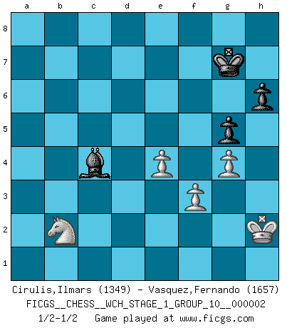 Last move : 1/2-1/2 2007 June 27 23:7:13 [Event "FICGS__CHESS__WCH_STAGE_1_GROUP_10__000002"] [Site "FICGS"] [Date "2007.01.16"] [Round "1"] [White "Cirulis,Ilmars"] [Black "Vasquez,Fernando"] [Result "1/2-1/2"] [WhiteElo "1349"] [BlackElo "1657"] 1.d4 d5 2.Nc3 Nf6 3.Bf4 Bf5 4.Nf3 e6 5.e3 Bb4 6.Bd3 Nc6 7.O-O Bxc3 8.bxc3 Ne4 9.c4 dxc4 10.Bxc4 O-O 11.h3 Nb4 12.Qb1 a5 13.Qb3 b6 14.a3 Nd5 15.Bxd5 exd5 16.c4 Be6 17.Qd3 Bf5 18.Qe2 Re8 19.Rfc1 c5 20.cxd5 Qxd5 21.Qb5 Re6 22.Qc4 Qxc4 23.Rxc4 f6 24.dxc5 bxc5 25.Rd1 g5 26.Bh2 Rb6 27.Ne1 Rb3 28.f3 Nc3 29.Rd6 Bg6 30.e4 Rxa3 31.Rxf6 Na4 32.Rc1 Rb3 33.Rc6 Bf7 34.Ra1 Rb7 35.Nc2 Be8 36.Re6 Bd7 37.Re5 h6 38.Ne3 Rab8 39.Rf1 Rf8 40.Bg3 Nc3 41.Rxc5 Ne2+ 42.Kf2 Nxg3 43.Kxg3 Ra8 44.Ra1 a4 45.Rc3 Kg7 46.h4 Ra6 47.Nd5 Ra5 48.Rd3 Bb5 49.Rd2 Bd7 50.Ne3 R5a7 51.h5 Ra6 52.Ra3 Be6 53.Nd5 Bf7 54.Rd4 Rba7 55.Nc3 Be8 56.Rb4 Rc7 57.Kh2 Bxh5 58.R3xa4 Rxa4 59.Nxa4 Bf7 60.g4 Rc4 61.Rxc4 Bxc4 62.Nb2 1/2-1/2 Queen's pawn : Chigorin variation Kingside Castling by player White (move 7) Kingside Castling by player Black (move 10) 10 pieces endgame at move 61 : White KRNPPP , Black KBPP WHITE : King + 1 Rook 1 Knight 3 Pawns BLACK : King + 1 Bishop 2 Pawns 9 pieces endgame at move 61 : White KNPPP , Black KBPP WHITE : King + 1 Knight 3 Pawns BLACK : King + 1 Bishop 2 Pawns This chess game ended in a draw. Follow this game move after move (download)A man without frontiers. He didn't divide the East and the West, he brought them together in their admiration for him. (Ljubomir Ljubojevic, about Bobby Fischer's death) Karpov ist ein Museumsstück. (Garry Kasparov) ¡Examina movidas que hagan daño! Un buen ojo for movidas desvastantes es mucho mas importante que el conocimiento de principios estratégicos. (Purdy) La tactique, c'est ce que vous faites quand il y a quelque chose à faire; la stratégie, c'est ce que vous faites quand il n'y a rien à faire. (Savielli Tartacower) Chess is as much a mystery as women. (Purdy)