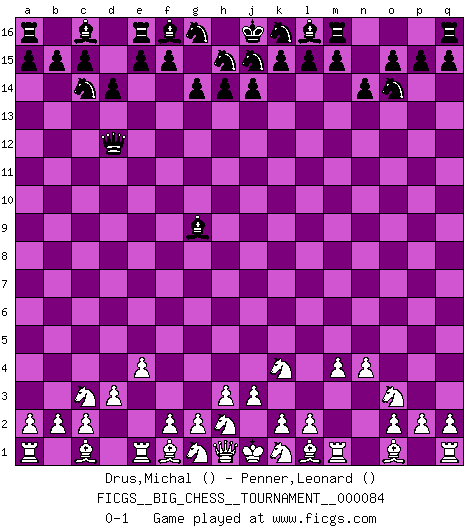 Last move : 0-1 2012 August 22 13:58:14 [Event "FICGS__BIG_CHESS__TOURNAMENT__000084"] [Site "FICGS"] [Date "2012.04.20"] [Round "1"] [White "Drus,Michal"] [Black "Penner,Leonard"] [Result "0-1"] [WhiteElo ""] [BlackElo ""] 1.d2-d3 d15-d14 2.b1-c3 n15-n14 3.e2-e4 g15-g14 4.j2-k4 h16-d12 5.m2-m4 o16-g9 6.p1-o3 b16-c14 7.n2-n4 p16-o14 0-1 This big chess game has been lost on time (started : 2012.04.20 5:30:35) Follow this game move after move (download)Morphy was probably the greatest genius of them all. (Bobby Fischer) Gewöhnliche Menschen denken nur daran, wie sie ihre Zeit verbringen. Ein intelligenter Mensch versucht, sie auszunutzen. (Arthur Schopenhauer) Un sacrificio se refuta mucho mejor al aceptarlo. (Wilhelm Steinitz) Avec des compensations pour le matériel en plus... (Anonyme) Ah, beer! The cause of, and the solution to, all of life's problems. (Homer Simpson)