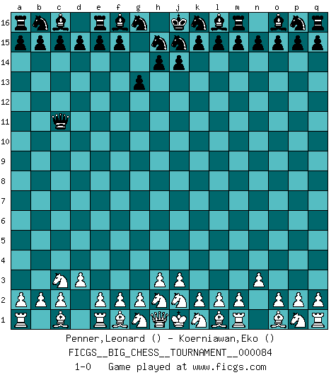 Last move : 1-0 2012 June 2 3:0:56 [Event "FICGS__BIG_CHESS__TOURNAMENT__000084"] [Site "FICGS"] [Date "2012.04.20"] [Round "1"] [White "Penner,Leonard"] [Black "Koerniawan,Eko"] [Result "1-0"] [WhiteElo ""] [BlackElo ""] 1.d2-d3 g15-g13 2.n2-n3 h16-c11 3.b1-c3 1-0 This big chess game has been lost on time (started : 2012.04.20 5:30:35) Follow this game move after move (download)A passed Pawn increases in strength as the number of pieces on the board diminishes. (Capablanca) Dass jemand wie Surab Asmaiparaschwili, der selbst Elopunkte gekauft hat , Vize-Präsident der Fide werden konnte, sagt schon einges über den Zustand dieser Organisation aus. (Joel Lautier) Una buena memoria, concentración, imaginación y una fuerte voluntad, se requiere para llegar a ser un buen jugador. (Bobby Fischer) Aucun coup ne doit être joué sans but. (Pedro Damiano) Quotation,n.: The act of repeating erroneously the words of another. The words erroneously repeated. (Ambrose Bierce, The Devil's Dictionary)