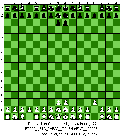 Last move : 1-0 2012 May 1 18:25:31 [Event "FICGS__BIG_CHESS__TOURNAMENT__000084"] [Site "FICGS"] [Date "2012.04.20"] [Round "1"] [White "Drus,Michal"] [Black "Higuita,Henry"] [Result "1-0"] [WhiteElo ""] [BlackElo ""] 1.n2-n3 1-0 Follow this game move after move (download)Fischer wanted to give the Russians a taste of their own medicine. (Larry Evans) Ich kenne Menschen, die allen Willen der Welt besitzen und doch nicht Schach spielen können. (Robert James Fischer) En manos de Fischer's, una diminuta ventaja teórica es tan buena como tener una Reina de ventaja. (Isaac Kashdan) La guerre est enfant de la passion, la passion est enfant du narcissisme et le narcissisme est l'enfant. (...) Une autre partie ? (Thibault de Vassal) Perception is reality. (Immanuel Kant)