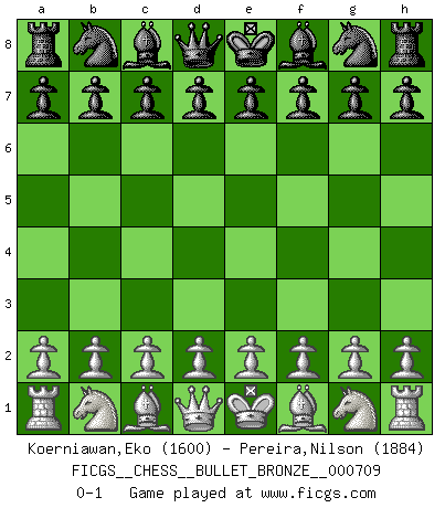 Last move : 0-1 2012 April 22 12:1:18 [Event "FICGS__CHESS__BULLET_BRONZE__000709"] [Site "FICGS"] [Date "2012.04.22"] [Round "1"] [White "Koerniawan,Eko"] [Black "Pereira,Nilson"] [Result "0-1"] [WhiteElo "1600"] [BlackElo "1884"] 0-1 This chess game has been lost on time (started : 2012.04.22 8:18:37) Player Black won this chess game. Follow this game move after move (download)Spassky will not be psyched out by Fischer. (Mike Goodall) Ein Springer auf f6 gegen die eigene Rochadestellung ist schlimmer als ein rostiger Nagel im Knie. (Efim Bogoljubov) El Ajedrez es de 30 a 40 por ciento psicología. Uno no cuenta con esto cuando se juega contra una computadora. No lo puedo confundir. (Judith Polgar) On entre au jeu d'Echecs comme on entre en Religion. Pour le joueur d'Echecs, la partie d'Echecs c'est l'office, la messe, le défilé du 1er Mai, le dépôt de gerbe au Monument aux Morts. C'est un drame sacré. (Michel Roos) If we knew what we were doing, we would not call it research. (Albert Einstein)