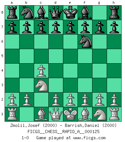 Last move : 1-0 2012 June 6 15:22:44 [Event "FICGS__CHESS__RAPID_A__000125"] [Site "FICGS"] [Date "2012.04.25"] [Round "1"] [White "Zmolil,Josef"] [Black "Barrish,Daniel"] [Result "1-0"] [WhiteElo "2000"] [BlackElo "2000"] 1.c4 Nf6 2.Nc3 1-0 This chess game has been lost on time (started : 2012.04.25 0:6:33) English Opening Player White won this chess game. Follow this game move after move (download)Fischer was a master of clarity and a king of artful positioning. His opponents would see where he was going but were powerless to stop him. (Bruce Pandolfini) Frage des Reporters: -Worin besteht das Ziel von Gambiteröffnungen? Antwort: -Auf Kosten der Partie einen Ruf als Angriffspieler zu erwerben.- (Siegbert Tarrasch) Hay jugadores fuertes y personas amables y yo soy un jugador fuerte. (Bobby Fischer) Votre prénom est 'Tactique', votre deuxième prénom est 'Tactique' et votre nom est 'Tactique'. (Ken Smith) Art disturbs, science reassures. (Georges Braque, Le Jour et la Nuit)