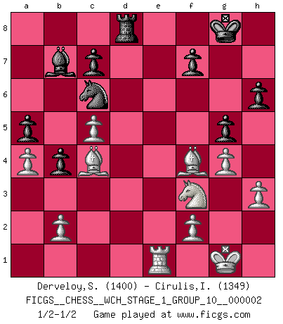 Last move : 1/2-1/2 2007 June 6 8:46:28 [Event "FICGS__CHESS__WCH_STAGE_1_GROUP_10__000002"] [Site "FICGS"] [Date "2007.01.16"] [Round "1"] [White "Derveloy,Stephane"] [Black "Cirulis,Ilmars"] [Result "1/2-1/2"] [WhiteElo "1400"] [BlackElo "1349"] 1.e4 Nc6 2.Nf3 e5 3.Bb5 a6 4.Ba4 Nf6 5.O-O Be7 6.Re1 b5 7.Bb3 O-O 8.h3 Bb7 9.d3 a5 10.a4 b4 11.Nbd2 Bc5 12.Nc4 Re8 13.c3 h6 14.d4 exd4 15.cxd4 d5 16.dxc5 dxc4 17.Bxc4 Rxe4 18.Qxd8+ Rxd8 19.Rxe4 Nxe4 20.Be3 g5 21.g4 Nf6 22.Re1 Nd5 23.Bc1 Nf4 24.Bxf4 1/2-1/2 KP : Nimzovich defense Kingside Castling by player White (move 5) Kingside Castling by player Black (move 7) This chess game ended in a draw. Follow this game move after move (download)It is difficult to play against Einstein's theory --on his first loss to Fischer. (Mikhail Tal) Ich verstehe den Grund nicht, warum die Aufteilung in Frauen und Männer überhaupt im Schach besteht. (Judith Polgar) Cuando no sepas que mover, espera por una idea que se le venga a la la cabeza de tu oponente. Tenlo por seguro de que esa idea estará incorrecta. (Siegbert Tarrasch) Les sacrifices démontrent seulement que quelqu'un a gaffé. (Savielly Tartacover) True nature is revealed in times of difficulty. (Chinese proverb)