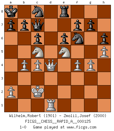 Last move : 1-0 2012 October 19 13:12:58 [Event "FICGS__CHESS__RAPID_A__000125"] [Site "FICGS"] [Date "2012.04.25"] [Round "1"] [White "Wilhelm,Robert"] [Black "Zmolil,Josef"] [Result "1-0"] [WhiteElo "1901"] [BlackElo "2000"] 1.e4 c6 2.d4 d5 3.Nd2 dxe4 4.Nxe4 Bf5 5.Ng3 Bg6 6.h4 h6 7.Nf3 Nd7 8.h5 Bh7 9.Bd3 Bxd3 10.Qxd3 e6 11.Bf4 Qa5+ 12.Bd2 Qc7 13.O-O-O Ngf6 14.Qe2 O-O-O 15.Ne5 Nb6 16.c4 Rxd4 17.Be3 Rxd1+ 18.Rxd1 Rg8 19.f4 Kb8 20.Ne4 Be7 21.Bc5 Bxc5 22.Nxc5 Qe7 23.Qf2 Ka8 24.g4 Qc7 25.Qd4 Nc8 26.Kc2 Re8 27.b4 1-0 Caro-Kann : 3.Nd2 Queenside Castling by player White (move 13) Queenside Castling by player Black (move 14) Player White won this chess game. Follow this game move after move (download)No Chess Grandmaster is normal; they only differ in the extent of their madness. (Viktor Korchnoi) Nie in meinem Leben habe ich die französische Verteidigung gespielt, welche die Stumpfsinnigste von allen ist. (Wilhelm Steinitz) Me gusta decir que Bobby Fischer fue el mejor jugador que jamás haya existido. Pero lo que hizo de Fischer un genio, fue su habilidad de mezclar una frescura y pragmatismo Americano con ideas Rusas acerca de la estrategia. (Bruce Pandolfini) La vie est comme un jeu d'échecs : nous esquissons un plan, mais celui-ci est tributaire de ce que daignent faire l'adversaire aux échecs et le destin dans la vie. (Arthur Schopenhauer) All battles are fought by scared men who'd rather be someplace else. (John Wayne in the movie In harm's way)