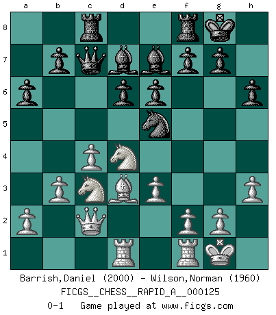 Last move : 0-1 2012 August 20 13:42:51 [Event "FICGS__CHESS__RAPID_A__000125"] [Site "FICGS"] [Date "2012.04.25"] [Round "1"] [White "Barrish,Daniel"] [Black "Wilson,Norman"] [Result "0-1"] [WhiteElo "2000"] [BlackElo "1960"] 1.d4 Nf6 2.c4 e6 3.Nc3 Bb4 4.Qc2 c5 5.dxc5 Qc7 6.Nf3 Bxc5 7.Bg5 a6 8.e3 Be7 9.Bd3 d6 10.O-O Nbd7 11.Nd4 Ne5 12.b3 h6 13.Bxf6 Bxf6 14.Rad1 O-O 15.Ne4 Be7 16.h3 Bd7 17.Nc3 Rac8 0-1 This chess game has been lost on time (started : 2012.04.25 0:6:33) Nimzo-Indian : Classical, 4...c5 Kingside Castling by player White (move 10) Kingside Castling by player Black (move 14) Player Black won this chess game. Follow this game move after move (download)Chess is a fairy tale of 1001 blunders. (Savielly Tartakower) Im Schach nämlich geht es darum, daß Ich des Gegners klein zu kriegen, sein Ego zu zerbrechen und zu zermahlen, seine Selbstachtung zu zertreten und zu verscharren und seine ganze mißachtenswerte sogenannte Persönlichkeit ein für alle Mal tot zu hacken und zu zerstampfen und dadurch die menschliche Gesellschaft von einer stinkenden Pestbeule zu befreien. Es ist ein königliches Spiel. (Robert James Fischer) ¿Porque tengo que perder ante este idiota?. (Aron Nimzovich) On peut tirer plus d'utilité d'une partie perdue que de 100 parties gagnées. (Capablanca) Don't anthropomorphize computers - they hate it. (Anonymous)