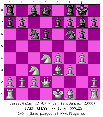 Last move : 1-0 2012 August 14 13:17:20 [Event "FICGS__CHESS__RAPID_A__000125"] [Site "FICGS"] [Date "2012.04.25"] [Round "1"] [White "James,Angus"] [Black "Barrish,Daniel"] [Result "1-0"] [WhiteElo "1978"] [BlackElo "2000"] 1.e4 c5 2.Nf3 d6 3.d4 cxd4 4.Nxd4 Nf6 5.Nc3 g6 6.Be3 Bg7 7.f3 O-O 8.Qd2 Nc6 9.g4 1-0 This chess game has been lost on time (started : 2012.04.25 0:6:33) Sicilian : Dragon, Yugoslav attack, 7...O-O Kingside Castling by player Black (move 7) Player White won this chess game. Follow this game move after move (download)Chess is really ninety nine percent calculation. (Soltis) Habe Mut, dich deines eigenen Verstandes zu bedienen. (Immanuel Kant) Una mala movida nulifica cuarenta buenas. (Horowitz) Le moment que je préfère le plus dans une rencontre, c'est celui où je sens que la personnalité de l'adversaire se brise. (Robert Fischer) Always remember that you are unique; just like everyone else. (Unknown)