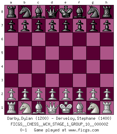Last move : 0-1 2007 March 1 18:11:49 [Event "FICGS__CHESS__WCH_STAGE_1_GROUP_10__000002"] [Site "FICGS"] [Date "2007.01.16"] [Round "1"] [White "Darby,Dylan"] [Black "Derveloy,Stephane"] [Result "0-1"] [WhiteElo "1200"] [BlackElo "1400"] 0-1 This chess game has been lost on time (started : 2007.01.16 15:21:32) Player Black won this chess game. Follow this game move after move (download)The way he plays Chess demonstrates a man's whole nature. (Stanley Ellin) Konzentriere dich auf materielle Gewinne. Nimm, was dir dein Gegner gibt, ausser es gibt einen guten Grund der dagegenspricht. (Robert James Fischer) Un mal plan es mejor que no tener ningún plan. (Frank Marshall) Toutes choses étant égales, c'est la conviction qui gagne. Alliée à une volonté de vaincre, elle sert de détonateur, suscite des idées, disperse les doutes et aide à penser clairement. (Robert Fischer) Nowadays, anyone who cannot speak English and is incapable of using the Internet is regarded as backward. (Al-Waleed bin Talal)