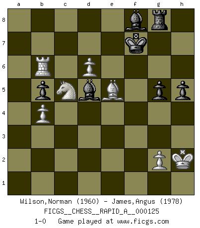 Last move : 1-0 2012 October 8 14:54:20 [Event "FICGS__CHESS__RAPID_A__000125"] [Site "FICGS"] [Date "2012.04.25"] [Round "1"] [White "Wilson,Norman"] [Black "James,Angus"] [Result "1-0"] [WhiteElo "1960"] [BlackElo "1978"] 1.e4 c5 2.Nf3 d6 3.Bb5+ Nd7 4.d4 cxd4 5.Qxd4 a6 6.Bxd7+ Bxd7 7.Bg5 h6 8.Bh4 Rc8 9.O-O Qc7 10.e5 e6 11.Nbd2 Qc5 12.Qxc5 Rxc5 13.exd6 Rxc2 14.Bg3 Nf6 15.Rfc1 Rxc1+ 16.Rxc1 Nd5 17.Ne4 b6 18.Nc3 Nxc3 19.Rxc3 f6 20.Rb3 b5 21.Ra3 Bc8 22.Rc3 Bd7 23.Rc7 h5 24.Ra7 Bc8 25.Ra8 Kd7 26.Ra7+ Ke8 27.h4 Rg8 28.Rc7 Bd7 29.Rb7 Bc8 30.Rb6 e5 31.Nd2 Be6 32.Ne4 Bxa2 33.Nc5 Kf7 34.Rxa6 Bd5 35.b4 Ke8 36.f3 Kf7 37.Kh2 Rh8 38.f4 exf4 39.Bxf4 Rg8 40.Rb6 g5 41.hxg5 fxg5 42.Be5 1-0 Sicilian : Canal-Sokolsky (Nimzovich-Rossolimo, Moscow) attack Kingside Castling by player White (move 9) Player White won this chess game. Follow this game move after move (download)When you don't know what to play, wait for an idea to come into your opponent's mind. You may be sure that idea will be wrong. (Siegbert Tarrasch) Zeige mir drei Eröffnungsvarianten und ich beweise dir, dass zwei davon inkorrekt sind. (Emanuel Lasker) Debió haber existido una vez en que los hombres eran semidióses, de otra manera no hubiesen podido inventar el Ajedrez. (Gustav Schenk) Assurément je connaissais par expérience le mystérieux attrait de ce jeu royal, le seul entre tous les jeux inventés par les hommes qui échappe souverainement à la tyrannie du hasard, le seul où l'on ne doive sa victoire qu'à son intelligence ou plutôt à une certaine forme d'intelligence. Mais n'est-ce pas déjà le limiter injurieusement que d'appeler les échecs un jeu ? N'est-ce pas une science, un art ou quelque chose qui, comme le cercueil de Mahomet entre ciel et terre, est suspendu entre l'un et l'autre, et qui réunit un nombre incroyable de contraires ? [...] C'est une pensée qui ne mène à rien, une mathématique qui n'établit rien, un art qui ne laisse pas d'uvre, une architecture sans matière; et il l'a prouvé néanmoins qu'il était plus durable, à sa manière, que les livres ou que tout autre monument, ce jeu unique qui appartient à tous les peuples et à tous les temps, et dont personne ne sait quel dieu en fit don à la terre pour tuer l'ennui, pour aiguiser l'esprit et stimuler l'âme. Où commence-t-il, où finit-il ? (Stefan Zweig) Good luck. You're gonna need it. (Han Solo in Star Wars ep.6)