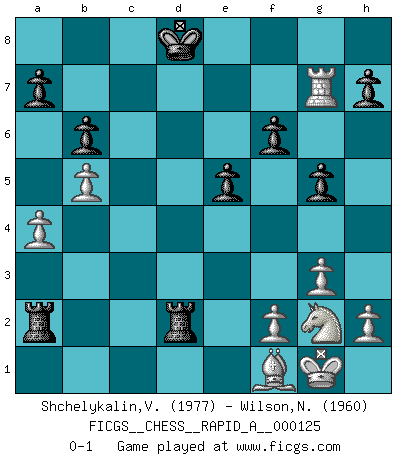 Last move : 0-1 2012 September 25 10:50:43 [Event "FICGS__CHESS__RAPID_A__000125"] [Site "FICGS"] [Date "2012.04.25"] [Round "1"] [White "Shchelykalin,Vyacheslav"] [Black "Wilson,Norman"] [Result "0-1"] [WhiteElo "1977"] [BlackElo "1960"] 1.d4 Nf6 2.c4 e6 3.Nf3 b6 4.g3 Bb7 5.Bg2 Be7 6.O-O O-O 7.Nc3 Ne4 8.Qc2 Nxc3 9.Qxc3 c5 10.Bf4 cxd4 11.Qxd4 d6 12.Qd3 Na6 13.Rfd1 Nc5 14.Qc2 Rc8 15.b4 Be4 16.Qc1 Nb7 17.Qe3 d5 18.cxd5 Bxd5 19.a3 Nd6 20.Qd3 Bf6 21.Bxd6 Qxd6 22.e4 Bxa1 23.Rxa1 Rfd8 24.exd5 Qxd5 25.Qe2 Qd3 26.Bf1 Qxe2 27.Bxe2 f6 28.a4 Rc2 29.Bf1 e5 30.b5 Kf8 31.Ne1 Rb2 32.Rc1 Ra2 33.Ng2 R8d2 34.Rc8+ Ke7 35.Rg8 g5 36.Rg7+ Kd8 0-1 Queen's Indian : Old Main line, 7.Nc3 Kingside Castling by player White (move 6) Kingside Castling by player Black (move 6) Player Black won this chess game. Follow this game move after move (download)The game of Chess is not merely an idle amusement; several very valuable qualities of the mind are to be acquired and strengthened by it, so as to become habits ready on all occasions; for life is a kind of Chess. (Benjamin Franklin) Ich bin stolz ein Bulgare zu sein. (Veselin Topalov) Todos los Maestros de Ajedrez fueron un día unos principiantes. (Chernev) Psychologiquement, tu dois avoir confiance en toi même, mais cette confiance doit être basée sur des faits. (Robert Fischer) Excelling at chess has long been considered a symbol of more general intelligence. That is an incorrect assumption in my view, as pleasant as it might be. But for the purposes of argument and investigation, chess is, in Russkin-Gutman's words, 'an unparalleled laboratory, since both the learning process and the degree of ability obtained can be objectified and quantified, providing an excellent comparative framework on which to use rigorous analytical techniques.' (The Chess Master and the Computer, by Garry Kasparov - 2010)