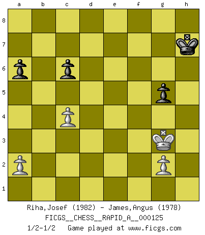 Last move : 1/2-1/2 2012 September 12 15:50:58 [Event "FICGS__CHESS__RAPID_A__000125"] [Site "FICGS"] [Date "2012.04.25"] [Round "1"] [White "Riha,Josef"] [Black "James,Angus"] [Result "1/2-1/2"] [WhiteElo "1982"] [BlackElo "1978"] 1.Nf3 d5 2.d4 Nf6 3.c4 e6 4.Nc3 Be7 5.Bg5 O-O 6.e3 Nbd7 7.Rc1 a6 8.cxd5 exd5 9.Bd3 c6 10.O-O Ne8 11.Bf4 Bd6 12.Re1 Bxf4 13.exf4 Nd6 14.Qc2 Nf6 15.Na4 Nfe4 16.Ne5 f6 17.f3 fxe5 18.fxe5 Nf5 19.fxe4 Nxd4 20.Qd2 dxe4 21.Rxe4 Kh8 22.Rf4 Ne6 23.Rxf8+ Nxf8 24.Qe3 Be6 25.Nb6 Rb8 26.Nc4 Qd5 27.b3 Nd7 28.Re1 Kg8 29.Nd6 b5 30.Bf5 g6 31.Bxe6+ Qxe6 32.h4 Rf8 33.h5 gxh5 34.Qg5+ Kh8 35.Re4 h6 36.Qxh5 Kh7 37.Re3 Rf6 38.Qe2 Nxe5 39.Nc4 bxc4 40.Rxe5 Qd6 41.Qe4+ Rg6 42.bxc4 Qd1+ 43.Kh2 Qg4 44.Qxg4 Rxg4 45.Rc5 Rg5 46.Rxg5 hxg5 47.Kg3 1/2-1/2 Reti Opening Kingside Castling by player Black (move 5) Kingside Castling by player White (move 10) 10 pieces endgame at move 44 : White KRPPP , Black KRPPP WHITE : King + 1 Rook 3 Pawns BLACK : King + 1 Rook 3 Pawns 9 pieces endgame at move 46 : White KRPPP , Black KPPP WHITE : King + 1 Rook 3 Pawns BLACK : King + 3 Pawns 8 pieces endgame at move 46 : White KPPP , Black KPPP WHITE : King + 3 Pawns BLACK : King + 3 Pawns This chess game ended in a draw. Follow this game move after move (download)Every Pawn is a potential Queen. (James Mason) Bogoljubow: Matt in vier Zügen! Tartakower: Ich verbitte mir jede Belästigung! (Savielly Grigorievitsch Tartakower) Solo puedes ser bueno en el Ajedrez si amas al juego. (Bobby Fischer) 'L'échange des dames est un coup dur pour les deux adversaires...' Un journaliste lors d'une partie du match Spassky-Fischer Experiences are the keys to life. (Daniel Parmet)