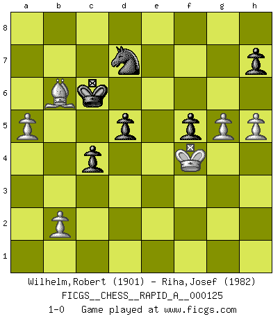 Last move : 1-0 2012 June 1 15:22:54 [Event "FICGS__CHESS__RAPID_A__000125"] [Site "FICGS"] [Date "2012.04.25"] [Round "1"] [White "Wilhelm,Robert"] [Black "Riha,Josef"] [Result "1-0"] [WhiteElo "1901"] [BlackElo "1982"] 1.e4 d5 2.exd5 Nf6 3.d4 Nxd5 4.Nf3 g6 5.Be2 Bg7 6.O-O O-O 7.c4 Nb6 8.Nc3 Bg4 9.h3 Bxf3 10.Bxf3 Nc6 11.c5 Nc4 12.d5 Nd4 13.Be4 e6 14.dxe6 Nxe6 15.Bd5 Na5 16.Bxe6 fxe6 17.Qg4 Qe8 18.Qb4 b6 19.Be3 Nb7 20.Rac1 Rf5 21.cxb6 axb6 22.Rfd1 Nd6 23.Qb3 Qf7 24.f3 Re8 25.Rd3 Ra5 26.Rcd1 Be5 27.a4 Qf8 28.Qc2 c5 29.Bf2 Qf4 30.g3 Qf5 31.Kg2 c4 32.R3d2 Qxc2 33.Rxc2 Bxc3 34.Rxc3 Rd5 35.Rxd5 exd5 36.Re3 Rxe3 37.Bxe3 Nc8 38.g4 Kf7 39.f4 Ke7 40.Bd4 Kd6 41.Kf3 Ke6 42.h4 Kd6 43.f5 gxf5 44.g5 Ne7 45.Bxb6 Nc6 46.a5 Ne5+ 47.Kg3 Kc6 48.h5 Nd7 49.Kf4 1-0 Scandinavian : Marshall variation Kingside Castling by player White (move 6) Kingside Castling by player Black (move 6) Player White won this chess game. Follow this game move after move (download)Chess is war over the board. The object is to crush the opponents mind. (Bobby Fischer) Stelle das Brett so, daß die Sonne in die Augen deines Gegners scheint. (Ruy López) Todavía soy una víctima del Ajedrez. Tiene toda la belleza del arte y mucho mas. No puede ser comercializado. El Ajedrez es mas puro que el arte en su posición social. (Marcel Duchamp) En blitz, le Cavalier l'emporte sur le Fou. (Vlastimil Hort) My poor ole parrot... Is not in the circulation of displays ....poo hoo hoo :) (Wayne Lowrance's enigma)